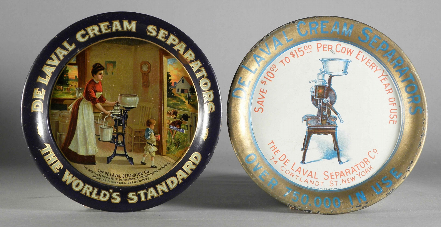 Two DeLaval Cream Separator Tin Tip Trays. "The World's Standard", near mint condition. "Over 750,000 in use", minor edge ware otherwise excellent condition. Each measures 4 1/4 inch diameter.