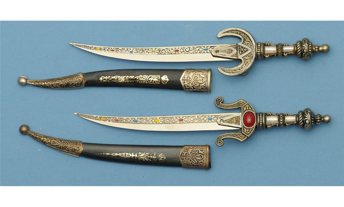 Both with 6 1/4 inch blades and sheaths. CONDITION: Very good overall with one sheath missing a small decorative piece.