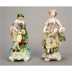 Two Derby figures, comprising; a model of a woman in rustic dress, a basket of eggs on one arm, fruit in her apron, 26.5cm high, circa 1760 (some small chips and areas of old restoration); and a figure of a musician, standing before a flower-encrusted stump beating a cymbal with a drum-stick, on scroll-moulded base, 26cm high, circa 1765 (minor chips and restoration) (see illustration) £200-400