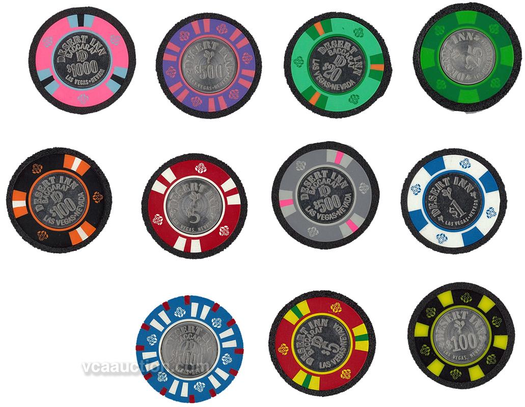 Two Desert Inn Chip Sets – Includes a set of standard table games chips ($5, $25, $100, $500 and $1000); and a set of Baccarat chips ($5, $20, $100, $500, $1000, and oversized $5000 chip with an unusual insert design). House mold, coin-silver inlays, eleven chips total, c1981.