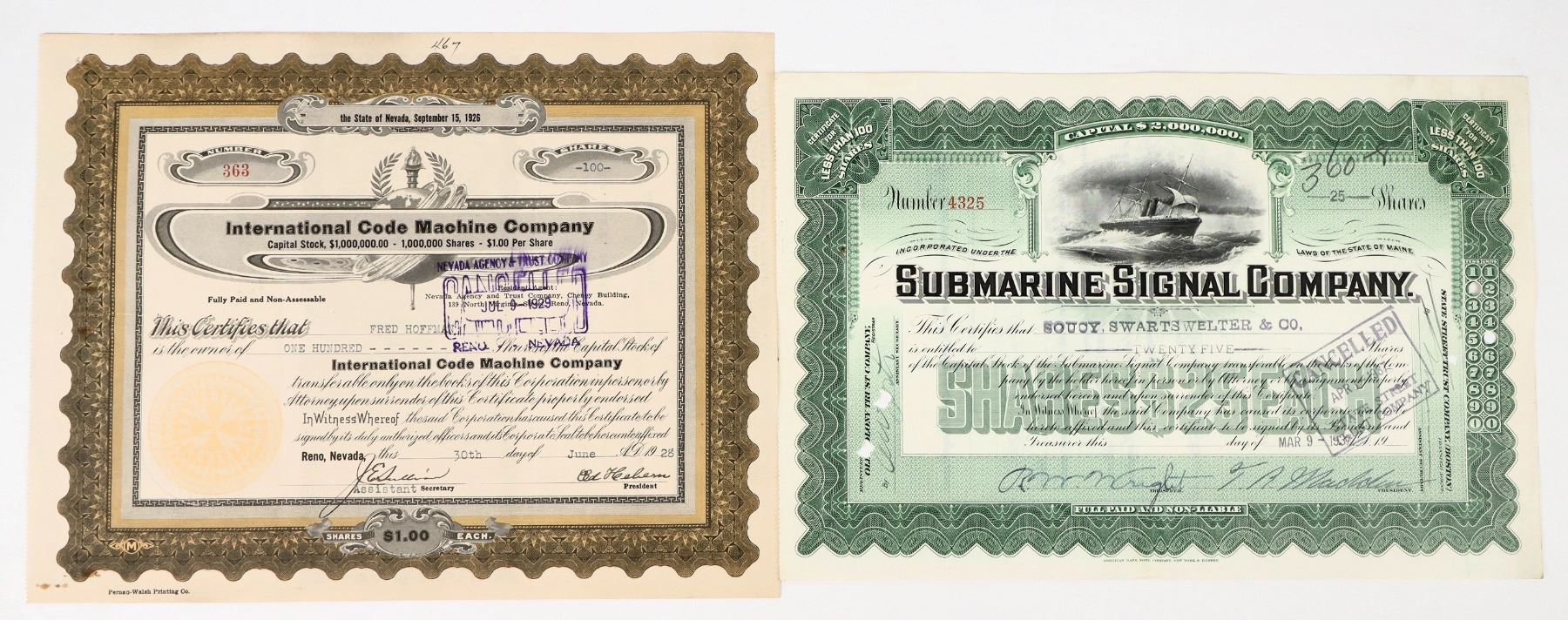 Lot of 2 different. 1) Submarine Signal Company. Issued in 1937, punch cancelled. Vignette of steamer ship. 2) International Code Machine Company. Issued in Reno, Nevada in 1928, stamp cancelled.