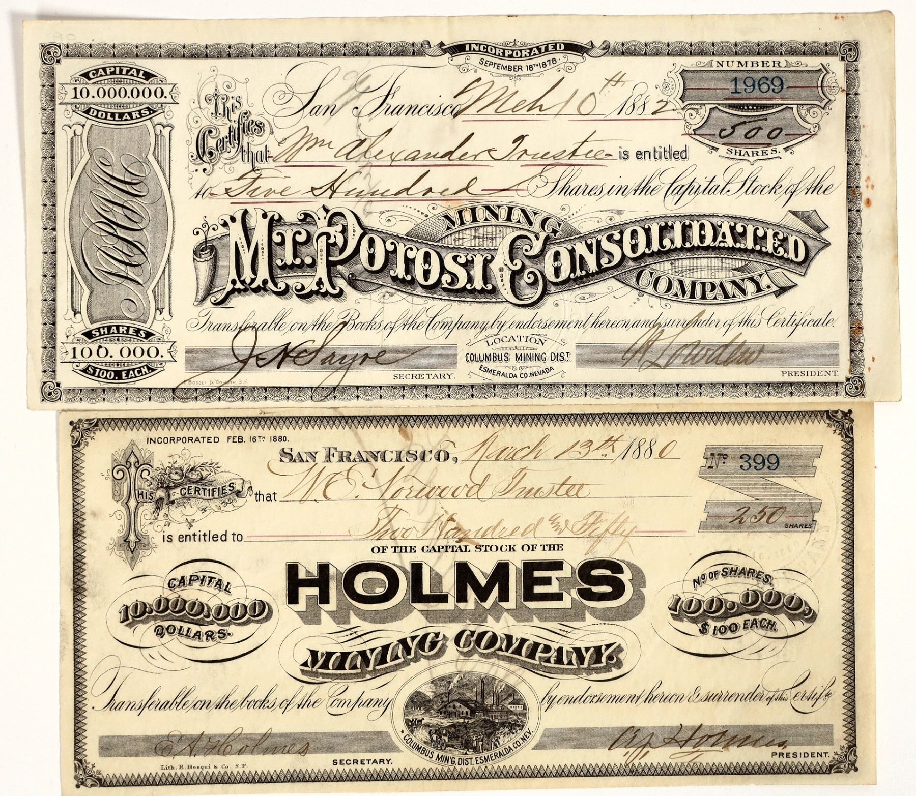 Lot of 2 different. Both are self-identified as Columbus Mining District. 1) Mt. Potosi Consolidated Mining Company. Location: Columbus Mining District, Esmeralda County, Nevada (printed at bottom center). Inc. Sept. 8, 1878. No. 1969, issued for 500 shares to Wm. Alexander in 1882. Signed by the president, M. Lowden and secretary JH Sayre. Not cancelled. Ornate logo, no vignette. Printed by E. Bosqui & Co. Lith., SF. 2) Holmes Mining Company. Rare Candelaria mining district stock for a mine operating just at the start of the twentieth century in response to the massive mining boom caused by Tonopah and Goldfield discoveries. Signed by AJ Holmes as president and EA Holmes as secretary. #399 for 250 shares issued in 1880. Incorporated Feb. 16, 1880. Location: Columbus Mining Dist., Esmeralda Co., Nev. Small milling vignette on bottom. Nice looking stock. In 1883 the Holmes made big news when they were involved in a major lawsuit with the Northern Belle. In 1886 they declared their first dividend and at least three more. In 1887 the mine and mill was closed through February.