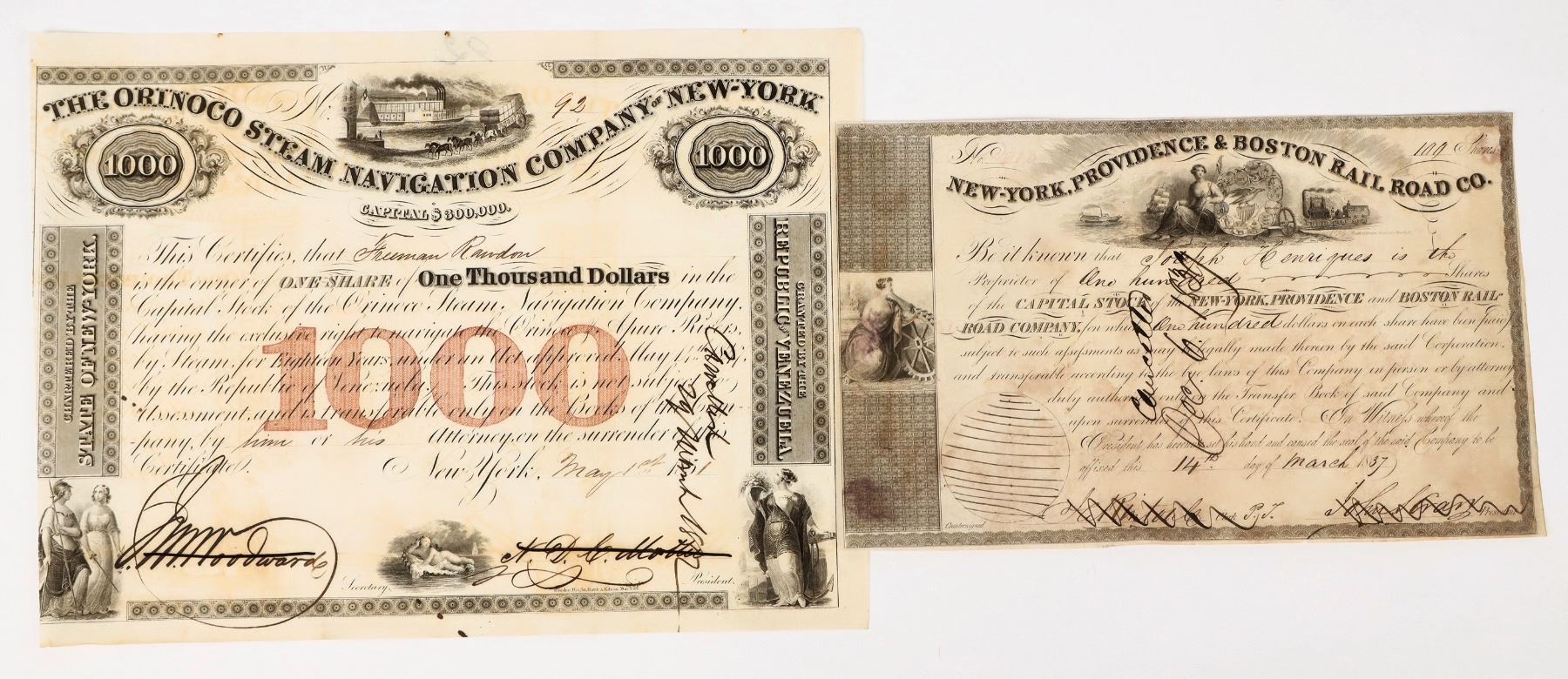 Lot of 2 different 1) Orinoco Steam Navigation Company of New York . Issued for one share in 1851. Pen cancelled. With four vignettes, including one of a steamboat arriving to pick up bales or packages being delivered on a horse-drawn wagon. Granted by the Republic of Venezuela and the State of New York. 2) New York, Providence & Boston Railroad Co. Issued in 1837, pen cancelled.