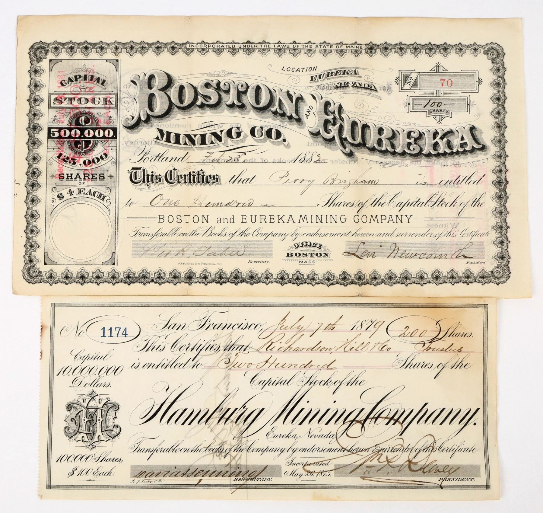 Lot of 2 different. 1) Hamburg Mining Company. Issued in 1879, not cancelled. Signed by president Dewey and secretary Jennings. Operated a placer operation in Fish Gulch, upper New York Canyon near Eureka, Eureka Co. 2) Boston & Eureka Mining Co. Eureka, Nevada printed on certificate. Issued in 1881 in Portland. Signed by president Levi Newcomb and secretary Taber. Not cancelled. Ornate font. Very rare.