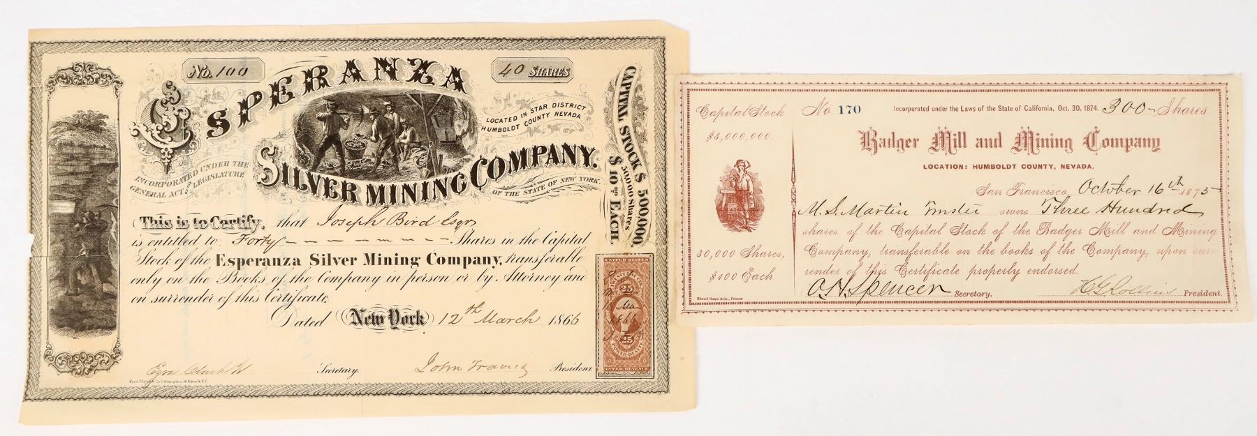 Lot of 2 different. 1) Esperanza Silver Mining Company. Star District, Humboldt County, Nevada printed on certificate (now part of Pershing County). Issued in 1866 for 40 shares. Signed by president John Travis and secretary Clark. Not cancelled. Two nice mining vignettes. Brittle with tears/separations. 2) Badger Mill and Mining Company. Issued in 1875 in SF to HS Martin. Signed by president Rollins and secretary Spencer. Not cancelled. Red print and mining vignette. Operated at the mouth of Bartlett Creek, Columbia District, west of Quinn River Valley, Humboldt Co.
