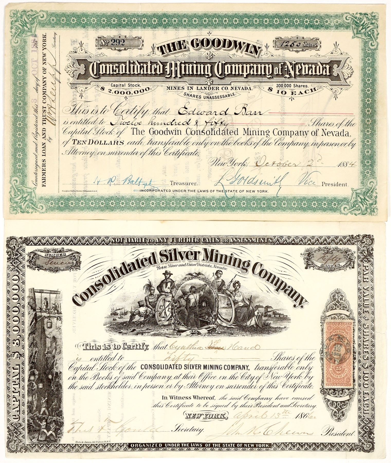 Lot of 2 different. 1) Consolidated Silver Mining Company. Reese River and Union Districts, Nevada (printed under title). Issued in 1866 for 50 shares. Allegorical and mine hoisting vignettes. 6.75 x 11.5" Inc. in New York. Folds, clean. 2) The Goodwin Consolidated Mining Company of Nevada. "Mines in Lander Co. Nevada" printed under title. According to 1882 and 1887 Nevada newspaper articles, the company's mine was located at Galena, Lander County, now a ghost town. Issued in 1884 to Edward Barr for 1250 shares. Signed by the vice president and treasurer. Not cancelled. Deep folds, clean. 6.25 x 11.5" Extremely rare!