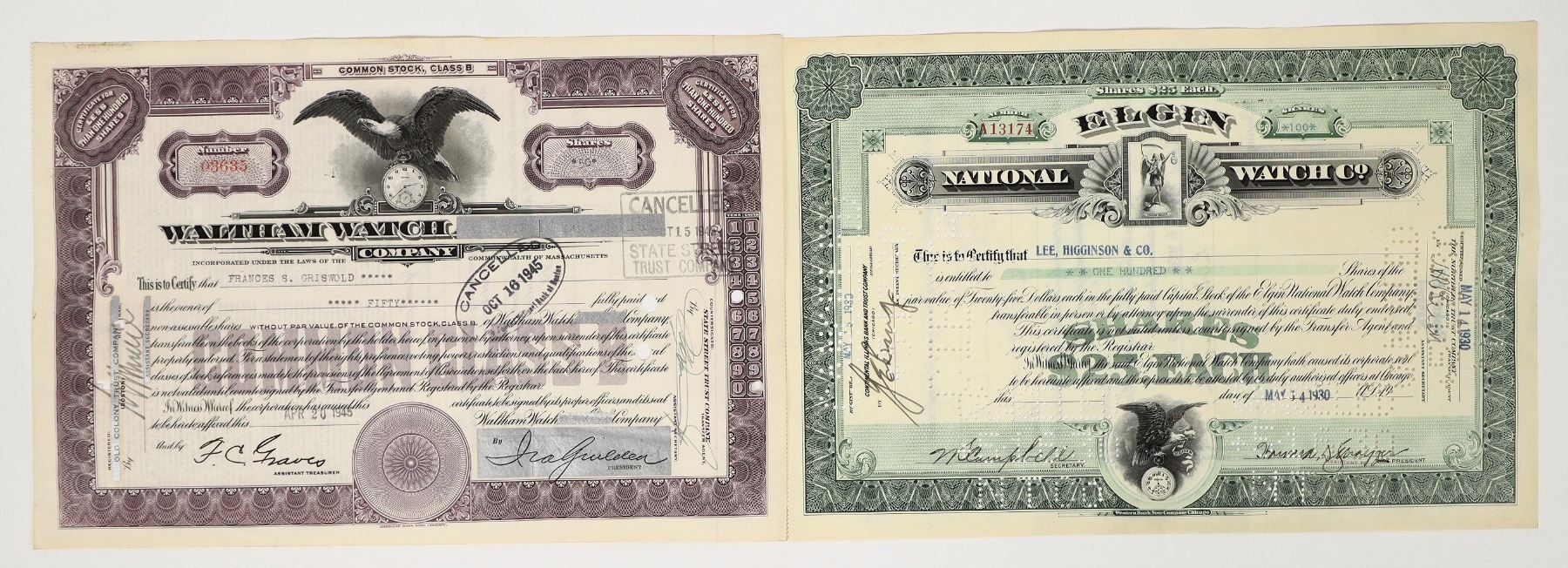 Lot of 2 different. 1) Elgin National Watch Company. Issued and cancelled, 1930. Western Bank Note Co. Green border, allegorical vignettes. 2) Waltham Watch Company. Issued and cancelled, 1945. Purple border, eagle vignette.