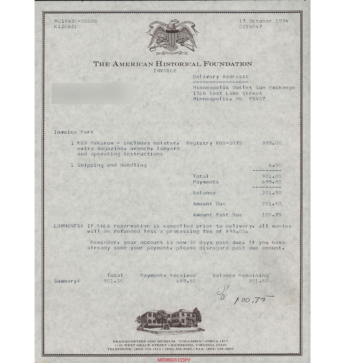 Each purchaser at this auction grants us a security in the property purchased. We may retain as collateral security for the purchaser’s obligations to us any of the purchaser’s property and all monies held or received by us. We may apply against such obligations monies held or received by us for the account of, or owing to, the purchaser. We retain all rights of a secured party under the Illinois Commercial Code. Whenever the purchaser pays only a part of the total price for one or more lots purchased, we may apply such payments, at our sole discretion, to the lot or lots we choose. Payment will not be deemed made in full until we have collected all amounts due in cash on good funds (by our definition). If the conditions of sale are not complied with, in addition to remedies available to us and the consignor by law, we hold the purchaser liable for the purchase price, 15% buyers premium, and applicable sales tax, we at our option may either (1) cancel the sale, retain as liquidated damages all payments made by the purchaser or (2) resell the property either publicly or privately, and in such an event the purchaser shall be liable for the payment of any deficiency plus all costs and expenses of both sales and our commission at our standard rates. The purchaser is also responsible for all other charges due hereunder attorney’s fees and incidental damages, etc.