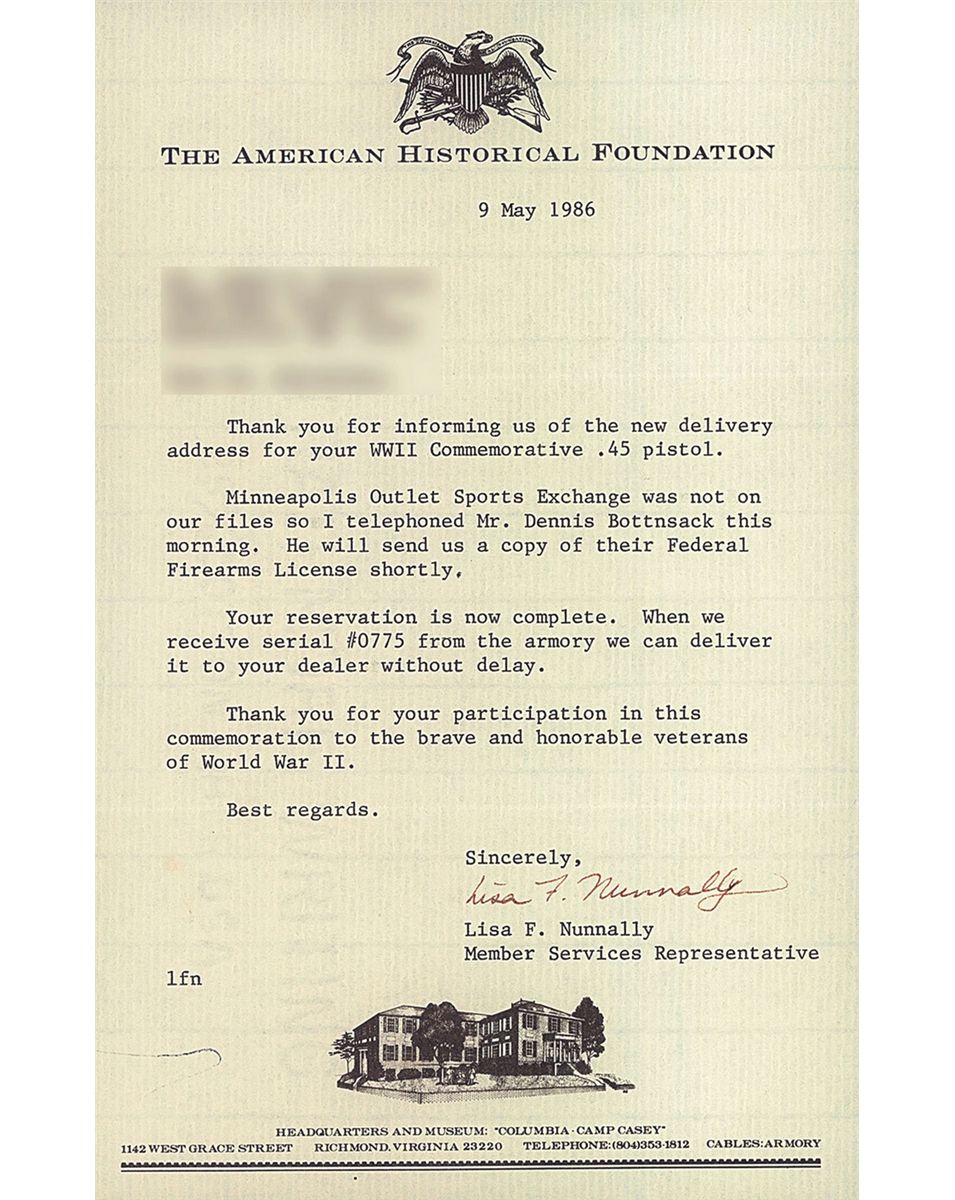 A) Issued by The American Historical Foundation. Standard markings and features of the World War II European-African-Middle Eastern Theater commemorative and of the Colt model 1911A1. Complete with a lidded, plexiglass faced wood display case with seven nickel plated dummy rounds of ammo.