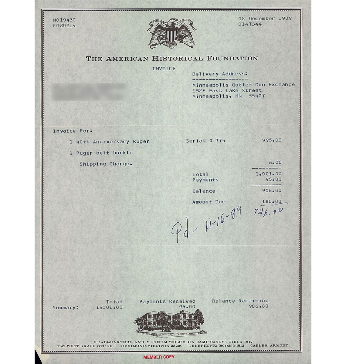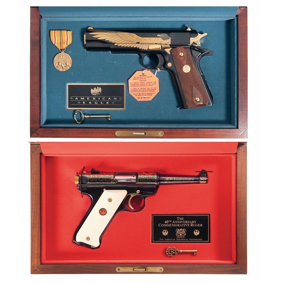 - B) Issued by The American Historical Foundation. Blue with gold overlaid floral design on the front sight band and receiver. Marked "40TH-775" on the left side of the frame. Standard features of the MK II and of the commemorative. Fitted with white plastic grips with the red Ruger medallion. Accompanied by a Certificate Of Authenticity indicating that "40TH-775" is in a limited edition of 950 world wide. Complete with a plexiglass faced wood display case.