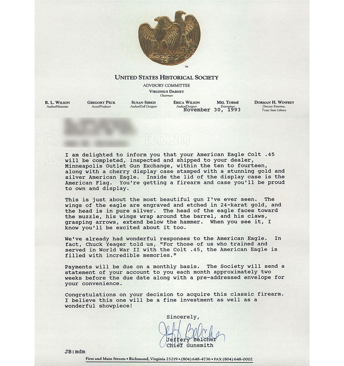 A) Issued by The American Historical Foundation. Blue with a gold and silver overlaid eagle on both sides of the slide and frame. Standard features of the commemorative and of the Colt model 1911A1. Accompanied by a letter from The American Historical Foundation and a Certificate Of Authenticity indicating that this pistol numbers 75 in an edition of 2500. Complete with a plexiglass faced wood display case with a Asia-Pacific campaign medal.