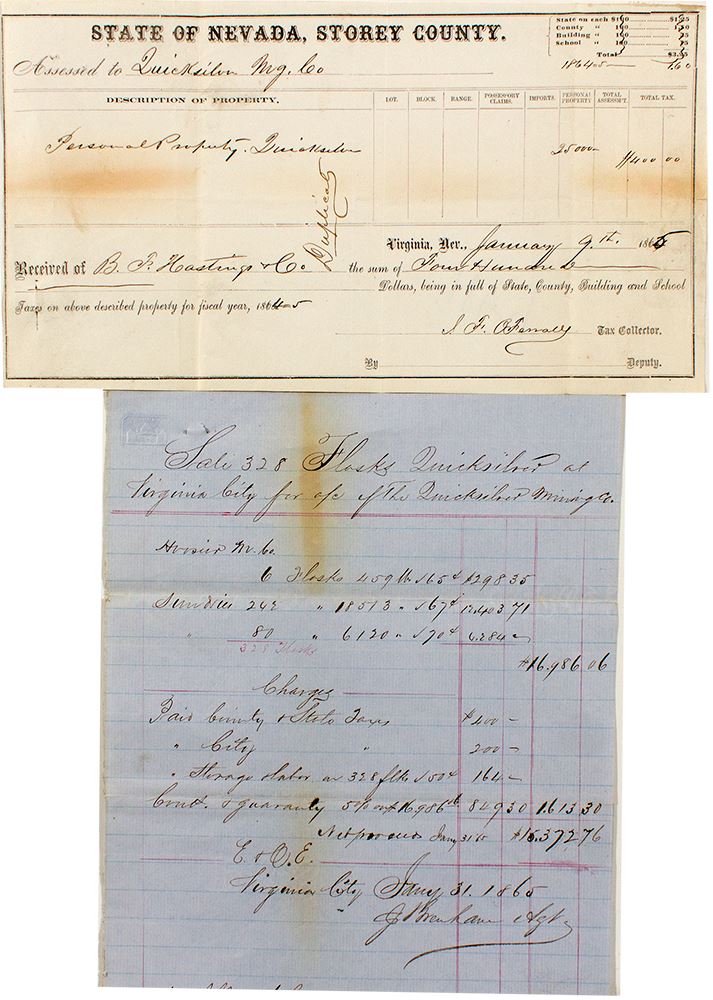 Storey County invoice, for taxes paid on $25,000 of quicksilver for the Quicksilver Mining Co., attached to a handwritten invoice for the sale of 328 flasks of quicksilver. County document measures 5.75" x 10.5" and is dated Jan. 9th, 1865. Handwritten invoice measures 12.5" x 7.75" and is dated Jan. 31, 1865. Folds and toning. Neat, early Comstock pieces!
