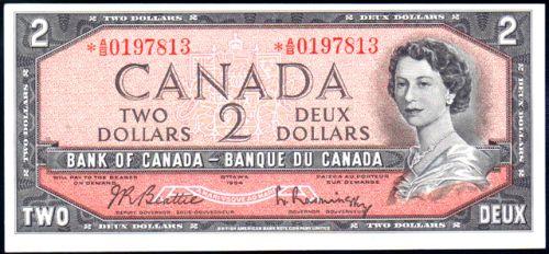 Bank of Canada Two Dollars 1954, Beattie-Rasminski, BC-38bA Serial Number *A/B0197813, which is higher than that reported in Charlton, AU
