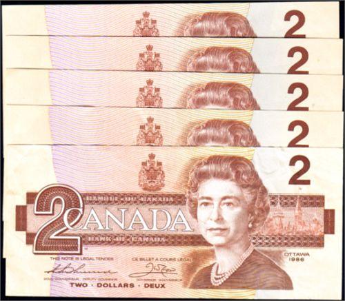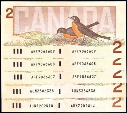 Bank of Canada Two Dollars, Crow-Bouey BC-55a, three consecutive Serial Numbers, including a Radar: ARF9066607 to ARF9066609, all Uncirculated. Plus BC-55a, AUN3386338, AU and Thiessen-Crow BC-55b, AUN7202414, VF-EF. A total of five notes