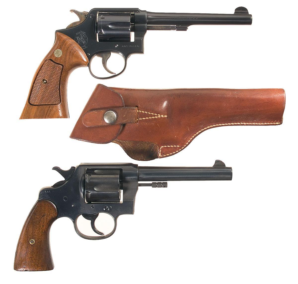 A) Manufactured 1945-47. Standard markings and features with replacement target grips. Complete with the original grips numbered to the gun and a brown leather Lawrence Holster.