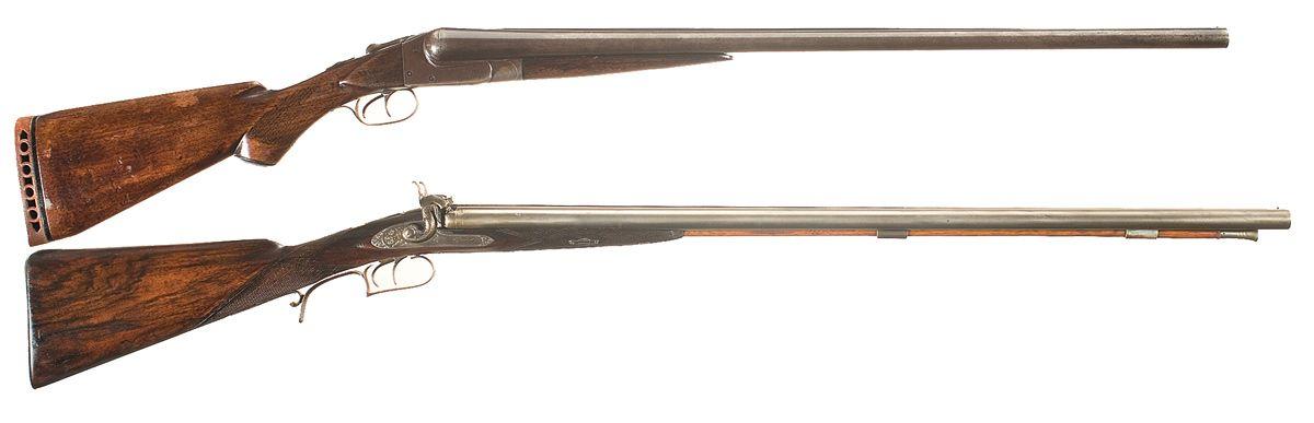 B) Single bead sights, Damascus barrels, engraved locks and hammers, double triggers, checkered straight grip stock and a textured buttplate. Modified chokes, 14" pull. Barrels cleaned.