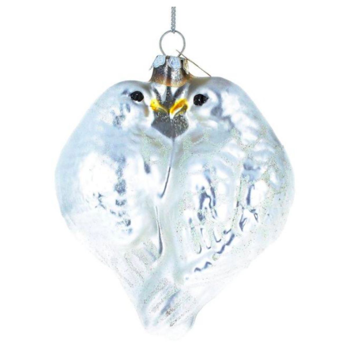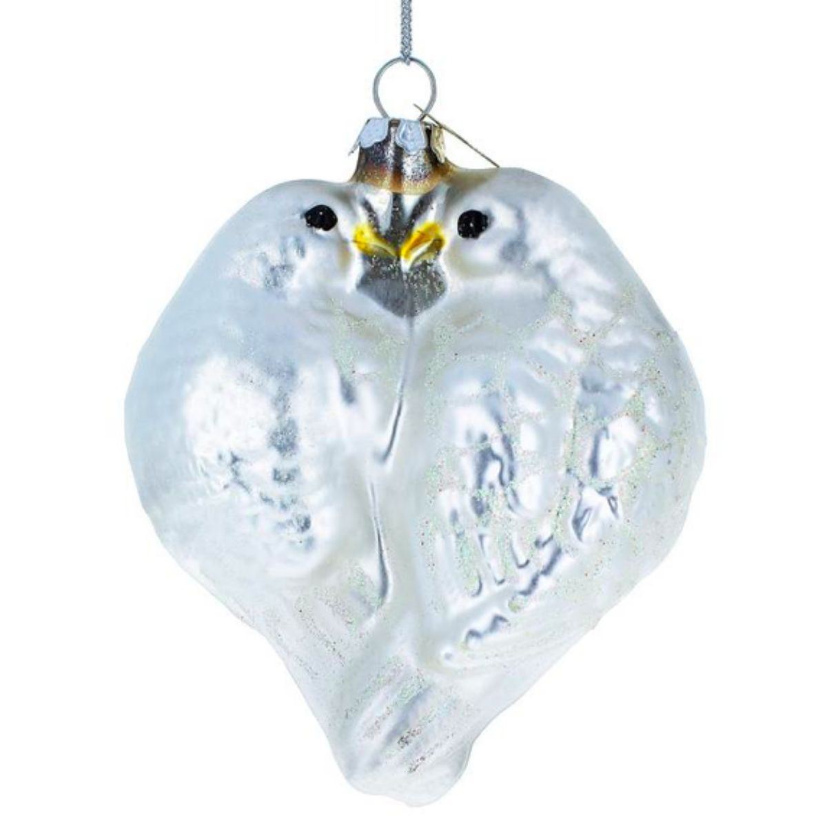 Handcrafted, hand painted, mouth blown glass ornament with glitter accent, depicts two doves in the shape of a heart.Â