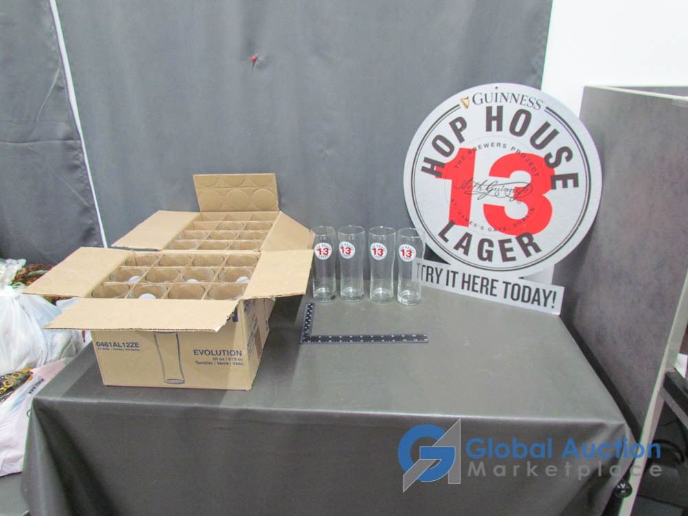 Two Dozen Hop House Lager Beer Glasses and Plastic Sign