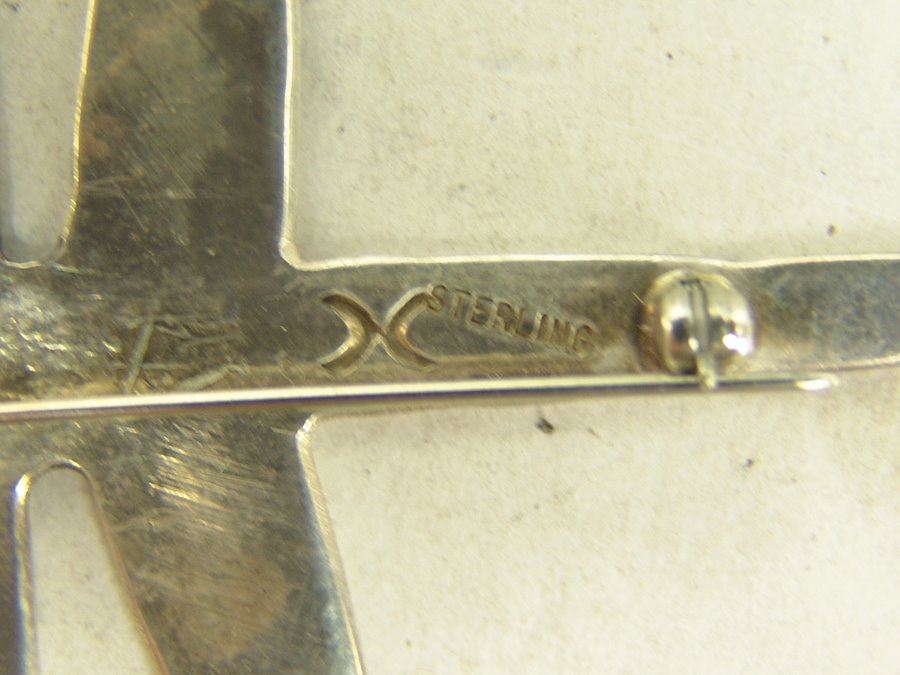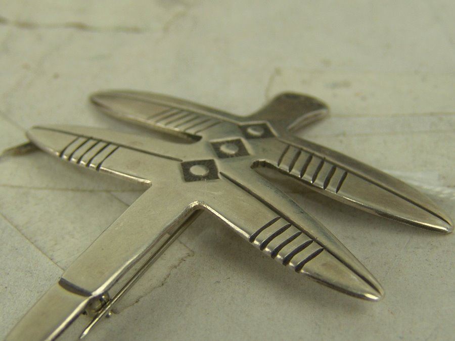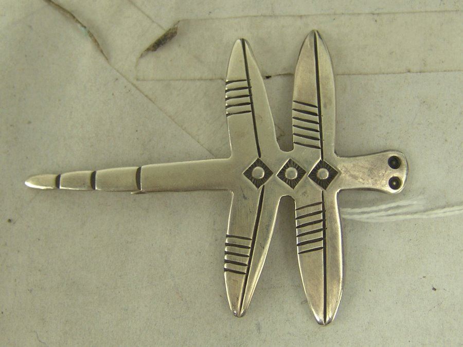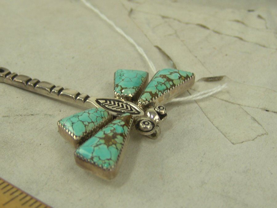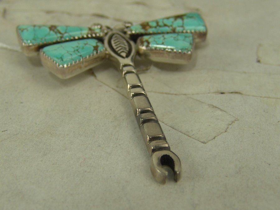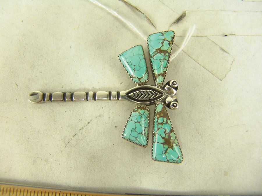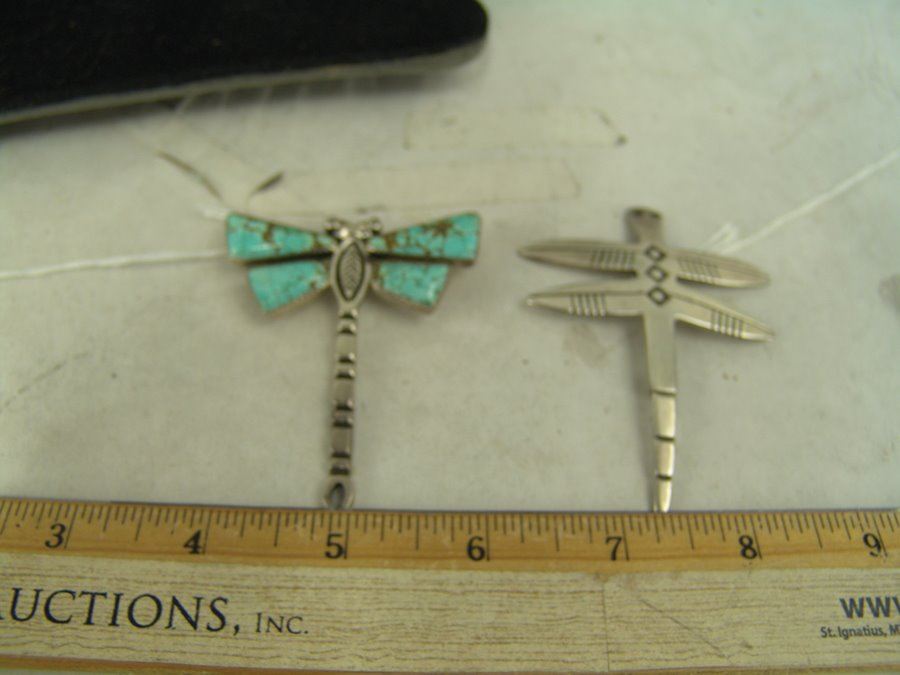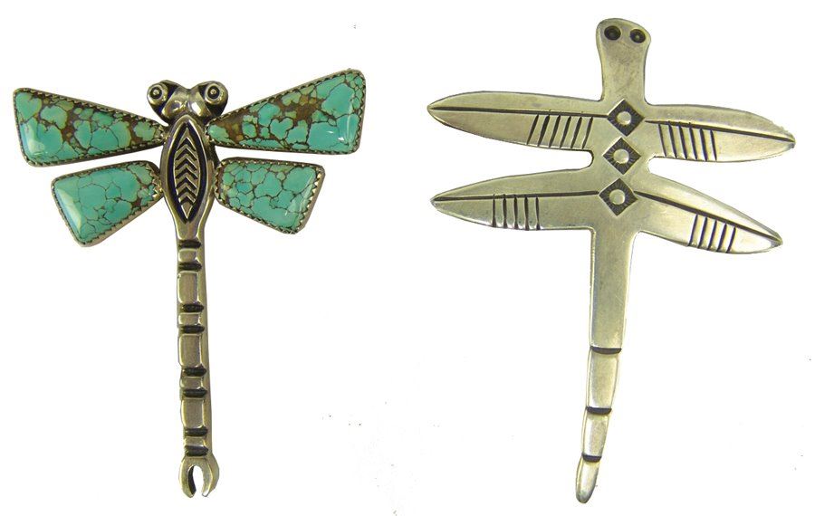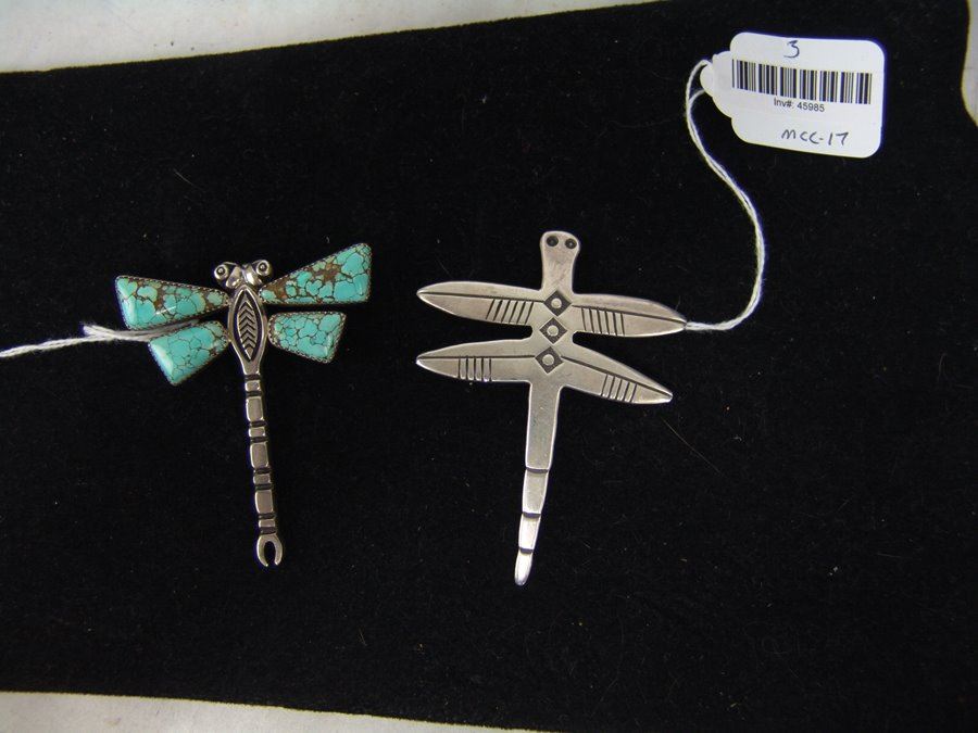 A wonderful, handwrought all silver Cochiti version by Cippy Crazy Horse, plus a fine Navajo example by Allison Lee that has beautiful, matching Godber/Burnham turquoise stones. Very good condition.,,2-3/4" & 3-3/8"