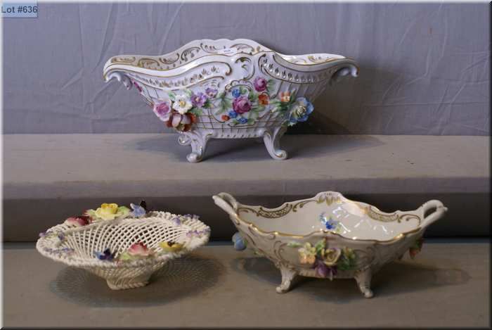 Two Dresden bowls with pierced edges and a Staffordshire spaghetti bowl