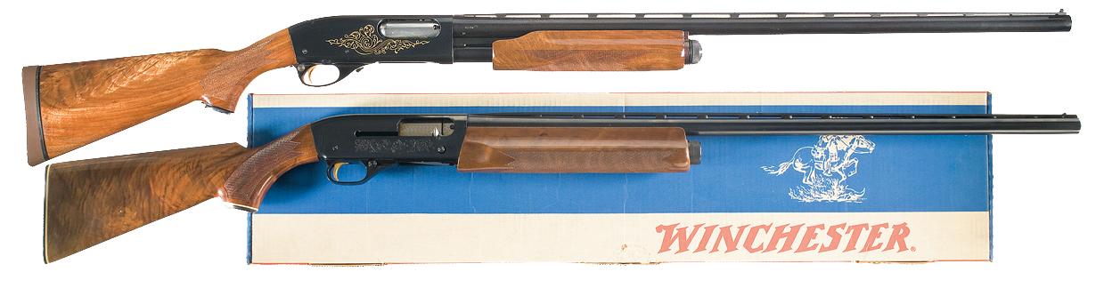 Double bead sights on vent rib barrel, choked full with a 2 3/4" chamber. Tight scroll engraved receiver with Ducks Unlimited Commemorative gold medallion on the left side, a jeweled bolt and follower and gold washed trigger. Checkered forearm and pistol grip stock with commemorative grip cap and plastic Winchester buttplate. Complete with box numbered to gun and papers. Length of pull is 14 1/4".