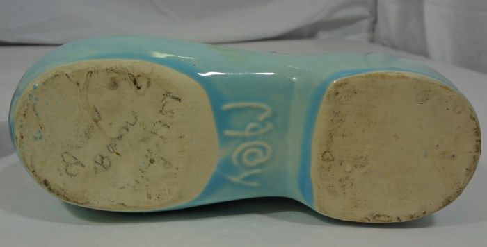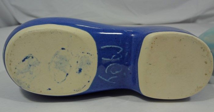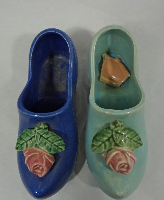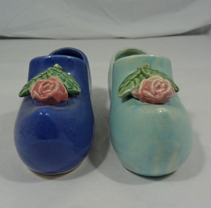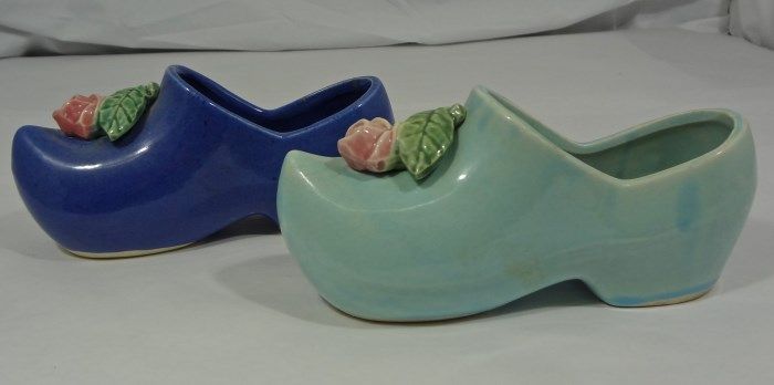 Two Dutch style shoe planters with roses stamped McCoy. Both are in great condition! One shoe is light blue and the other is a darker blue. Est Value $25.00-55.00