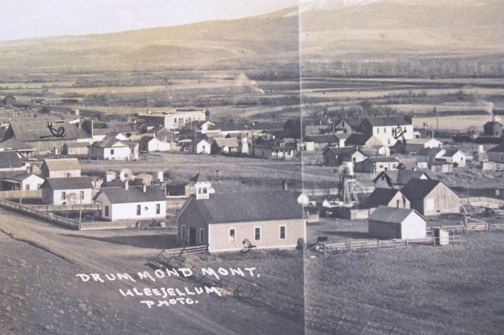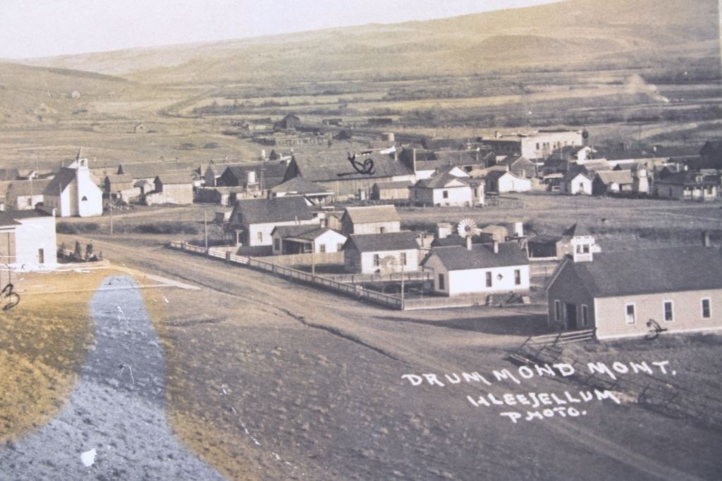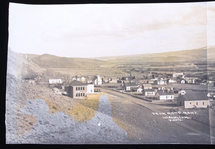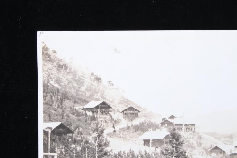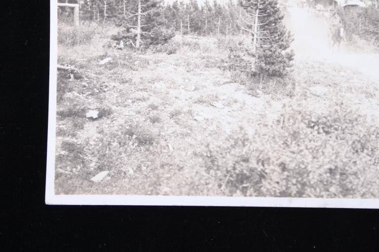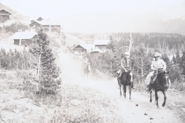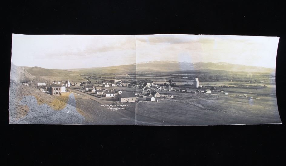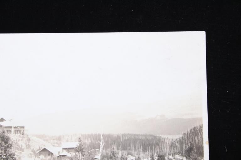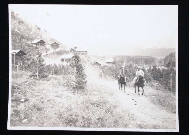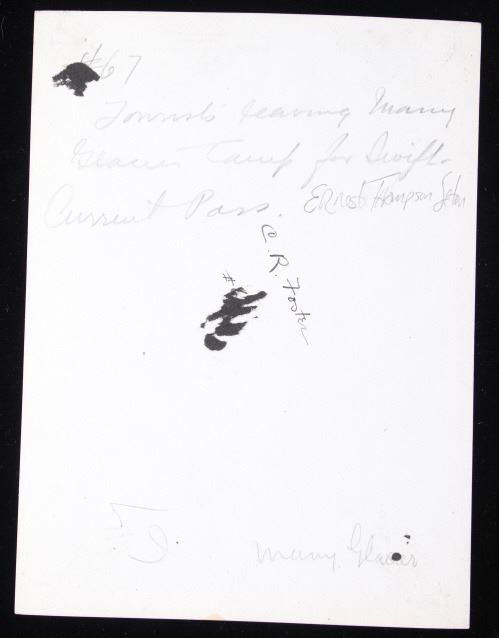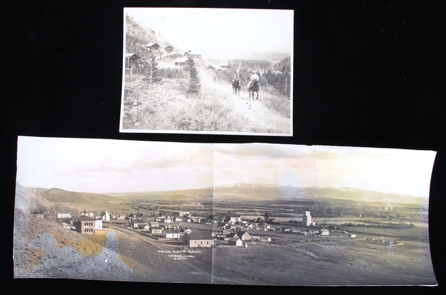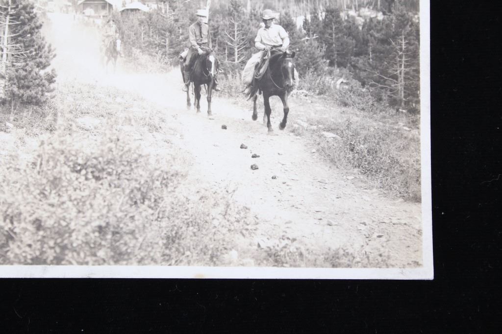 For your consideration are these two early Montana photos from two photographers, Ernest Thompson Seton and H. Lee Jellum. The first photo in this collection is by Ernest Thompson Seton (1860-1946) an English-born Canadian-American author, wildlife artist, photographer, and founder of the Woodcraft Indians in 1902 and one of the founding pioneers of the Boy Scouts of America in 1910. The photo depicts three men riding on horseback leaving Many Glaciers Camp. Many Glacier was built by the Great Northern Railway as the showplace of their network of chalets and hotels. A hardy crew of craftsmen overcame the difficulties of building what was then Montana's largest hotel while withstanding winter temperatures below zero degrees in order to have the hotel completed for a July 4, 1915 opening. On the back of the photo is gives a description of what is happening in the photo. It reads, " ? Leaving Many Glacier Camp for ? ? ?. Ernest Thompson Seton". Below that it reads, "C. R. Foster" and "67 Many Glaciers". The photo is in good condition overall with no signs of damage present. The photograph measures 5 7/8" L x 7 7/8" W. The second photo in this collection is from photographer H. Lee Jellum. The photograph shows Drummond, Montana from atop a hill in the early 1900s. The small town of Drummond can be seen from this one photo. It shows a chapel on the left side, a grain mill on the right hand side and houses and other buildings scattered throughout the center of the town. Some locations on the photo are numbered. The photo reads near the middle, "Drummond Mont., H Lee Jellum Photo". The photo shows some discoloration with spots of yellow and slight wear from its vintage age but is in overall good condition. It measures 6 1/2" L x 19 3/8" W.