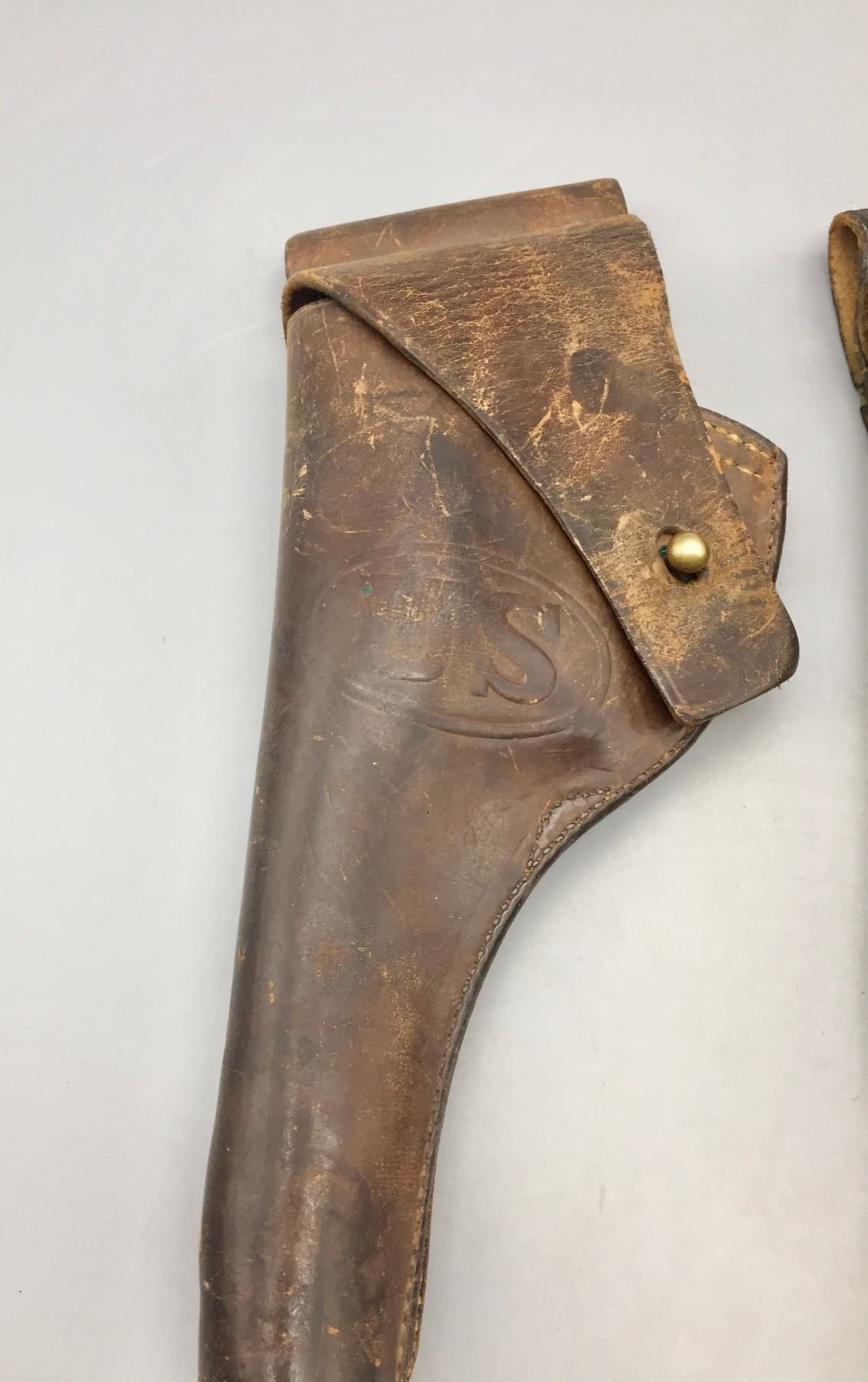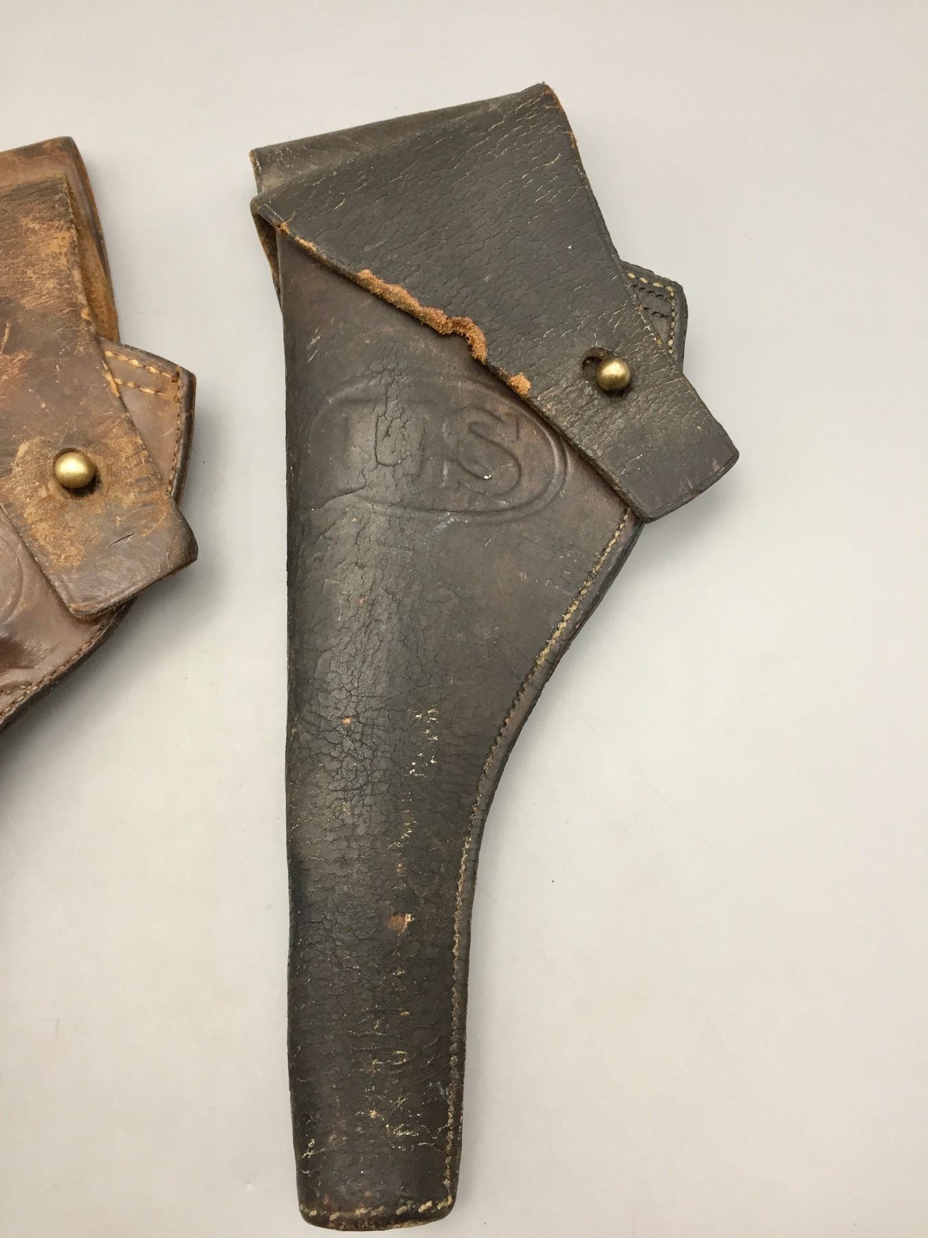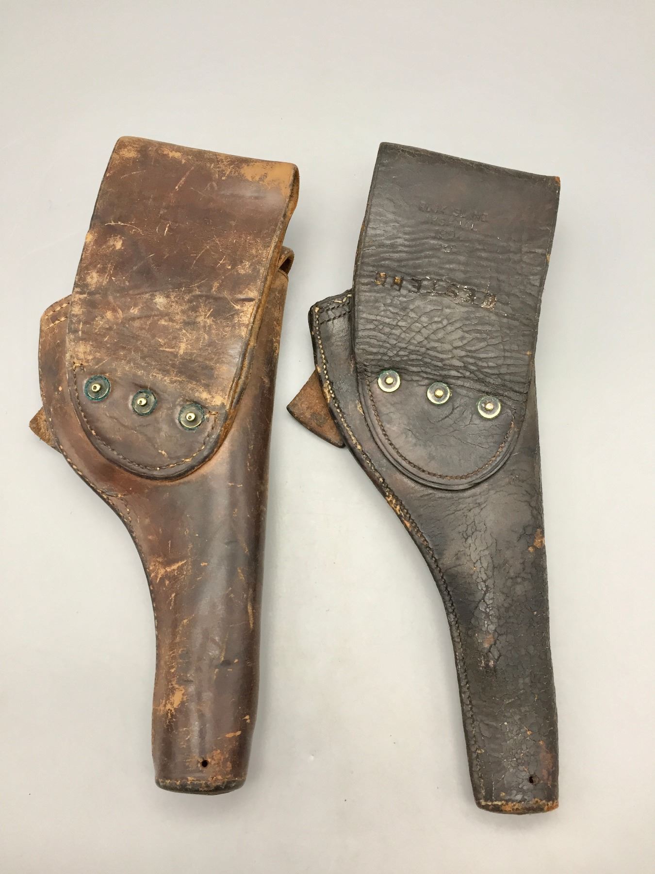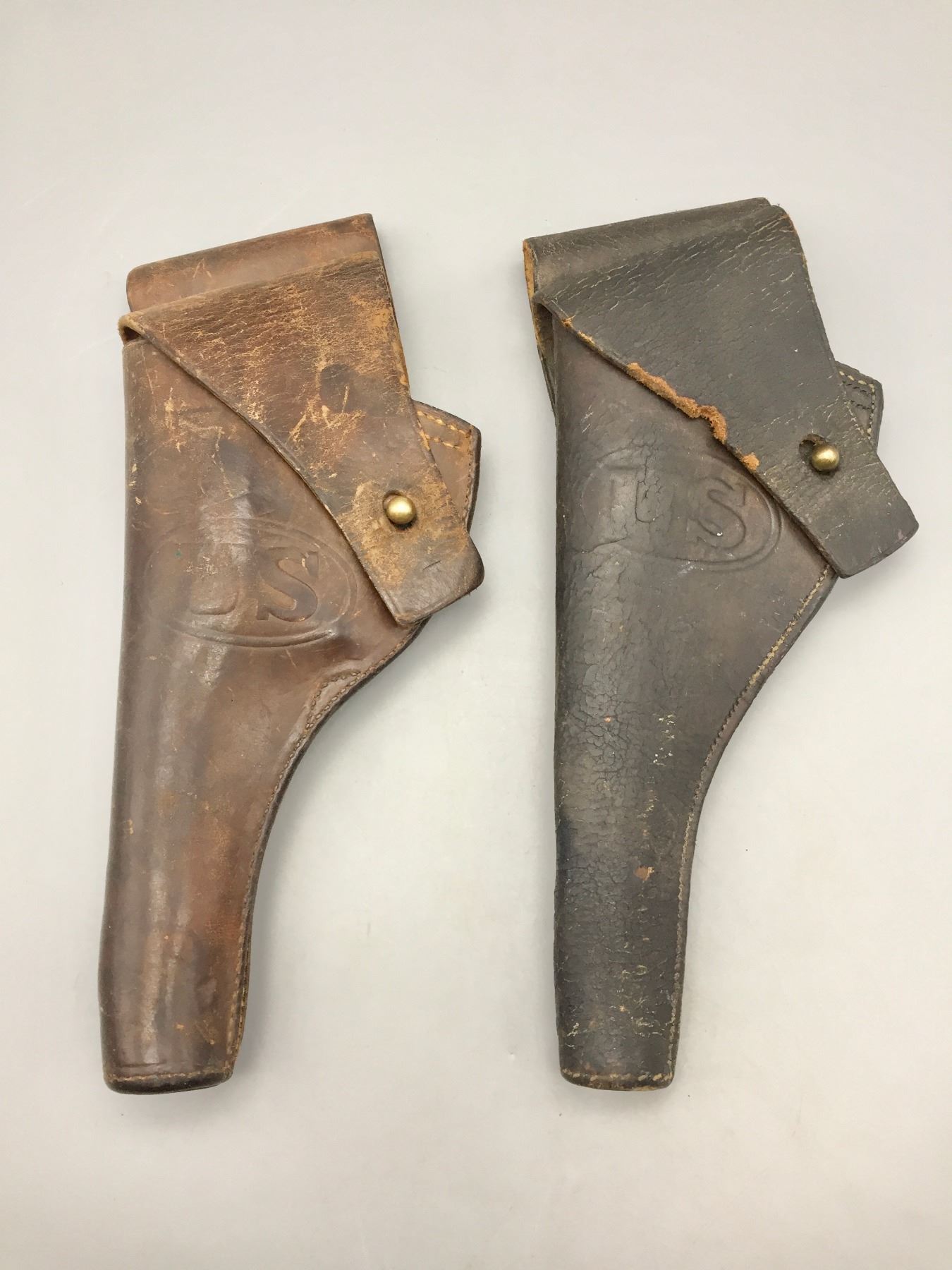 Description: For your bidding enjoyment we offer two early 1900s U.S. marked leather holsters. Both are Arsenal marked. Maker: One is stamped RIA and the other is hard to read, but is stamped. Approx. Age: One is dated 1904 and the other dated 1917. Size: 5”w x 11-1/4”long and 5”w x 12-1/4” long. Condition: Pretty good for their age, wear expected. Please look closely at the pictures - they are an important part of our description. Shipping: There will be a $5 handling / packaging fee for shipping this lot. The actual cost of postage will be added on top of that.