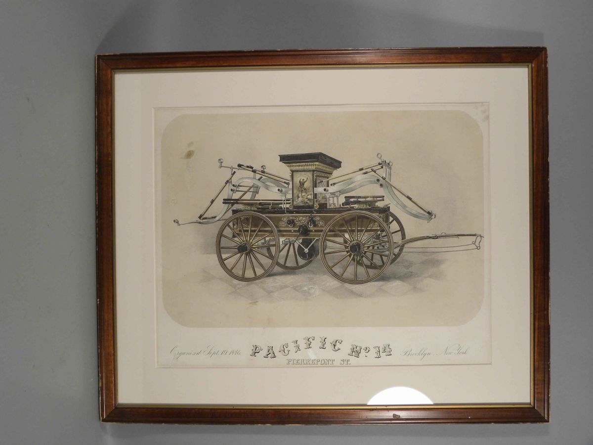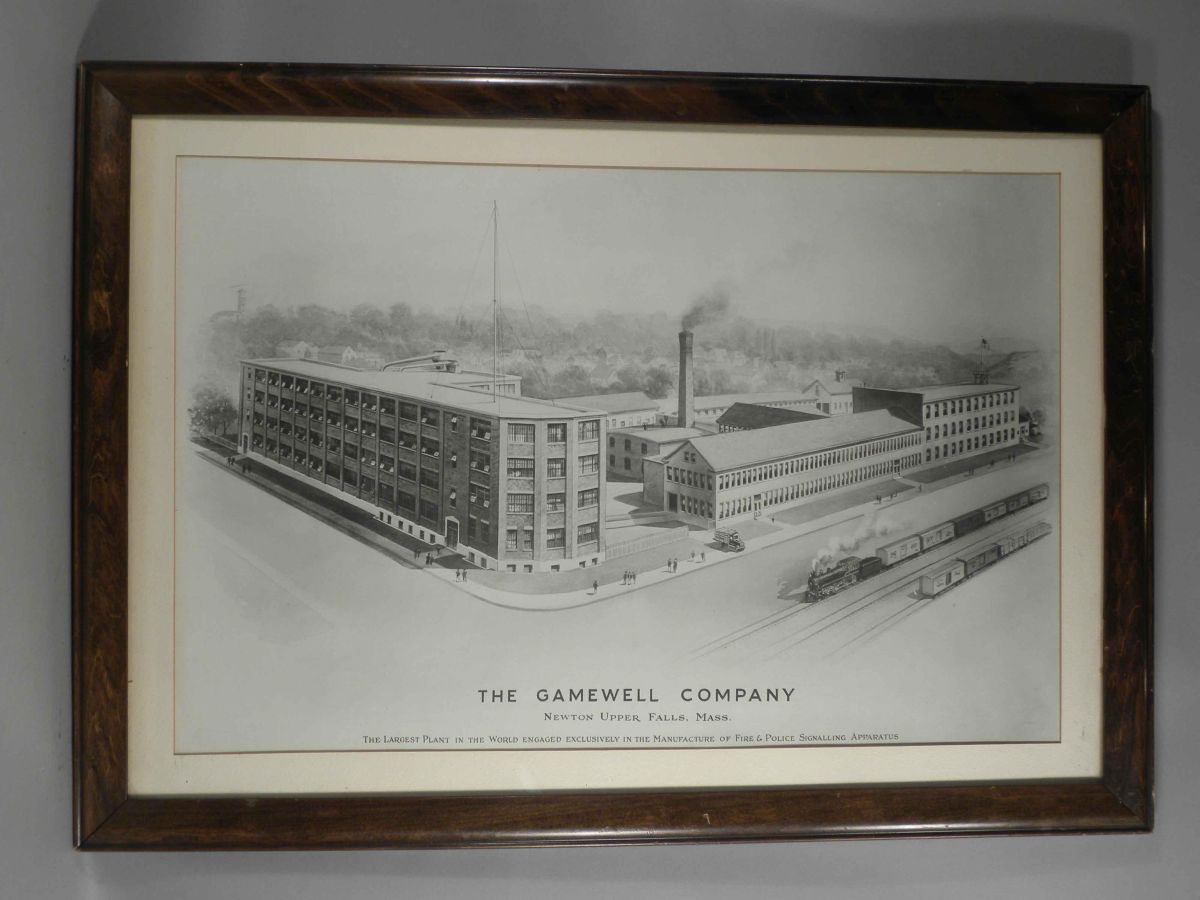 Early Hand Colored Lithograph, Depicting Pacific No. 14 Philadelphia Style Hand Engine. Organized Sept 19, 1846. Minor pencil rub in top left corner otherwise good condition. 19 1/4 X 15 inches. Early Litho Print of the Gamewell Company, Newton Upper Falls, Mass. Ca, 1920. Black and white. Excellent condition. Framed under glass. 26 X 17 inches.