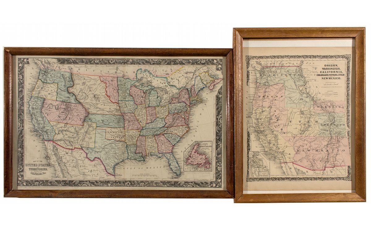 c1860 This is a pair of framed and matted maps, one of the western United States dated 1860 and the other, a full map of the United Staes, dated 1865. Both are in good condition, with the western map measuring 13"x 18" and the U.S. map, 15"x 24". Lynn Langdon Collection - HKA#65990