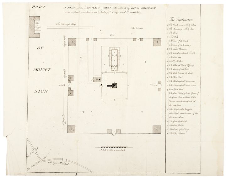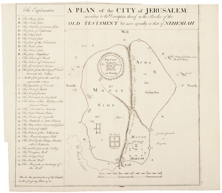 “A Plan of the City of Jerusalem according to the Description thereof in the Books of the Old Testament but more especially in that of Nehemiah.” An explanation down left margin names the important locations. Trimmed unevenly at top and left margins, and a V-shaped crease. “A Plan of the Temple of Jerusalem, Built by King Solomon as it is found recorded in the Books of Kings and Chronicles.” Explanation down right margin. Unevenly trimmed at top and left margins; scattered small blemishes and two tiny holes. Both maps are 15.5” x 15.75, no date; they were taken from a book, with subsequent folds. (2 items)