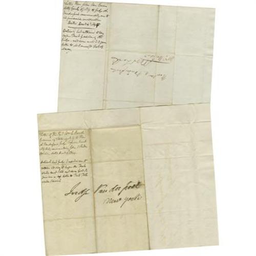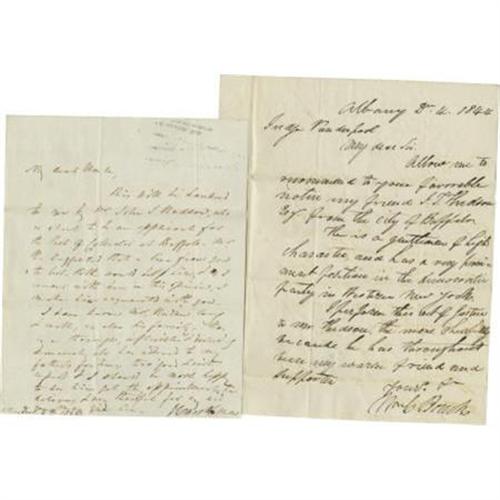 <B>Two Early New York Statesmen Autograph Letters Signed</B></I> "<I>Wm C Bouck</B></I>", "<I>J Van Buren</B></I>" respectively, two pages, 8" x 10", 1844, regarding appointment of John Hudson as Port Collector for Buffalo. Light transfer of modern toner to upper margin on one letter, else very good condition.<BR><BR><b>Shipping:</b> Flat Material, Small (<a target="_blank" href="http://www.heritageauctions.com/common/shipping.php">view shipping information</a>