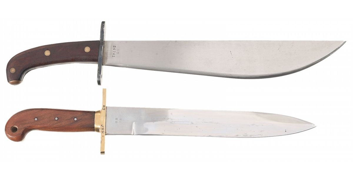 1) U.S. 1917 dated Plumb Bolo, very good, small crack in the handle. 2) Reproduction Ames 1849 dated short sword with 12" blade and wooden handle, very good.