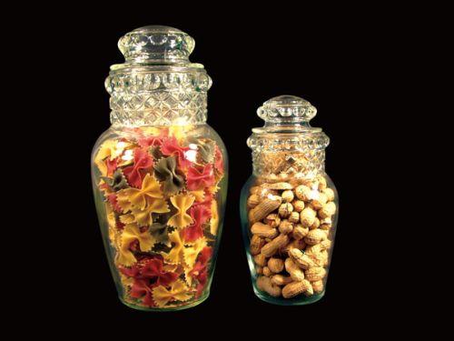 Two Egyptian Urn Style Candy Jars with loose fit tops. No chips or cracks. 13 and 10 inches tall.