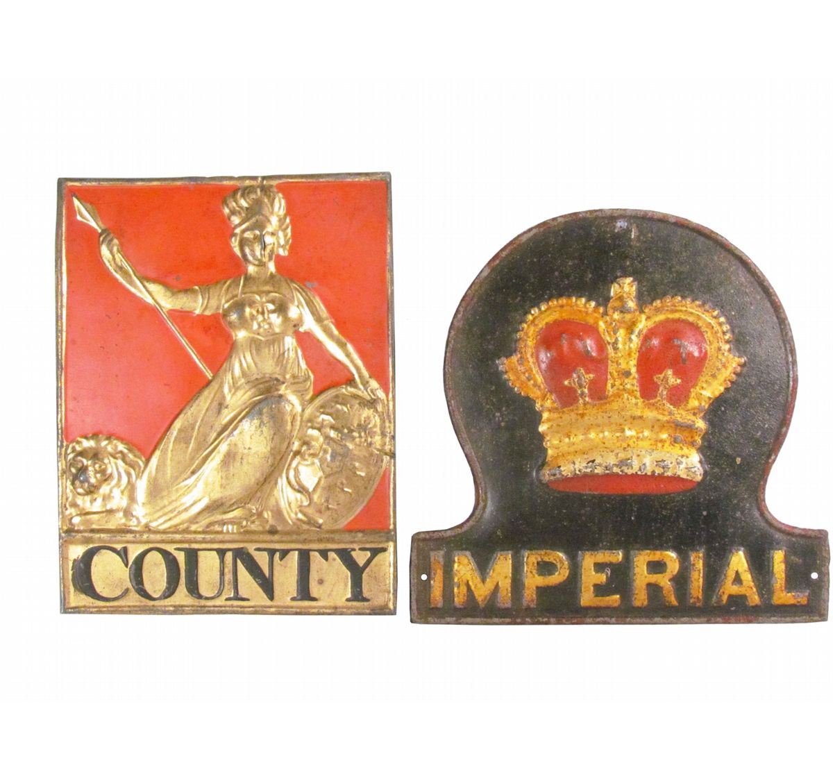 Two Embossed Tin English Fire Marks. Imperial and County. 8 1/4 X 8 and 6 1/2 X 8 1/2 inches tall.