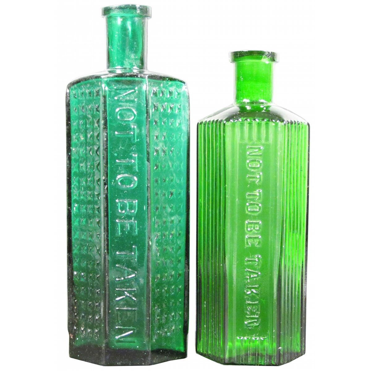 Two Embossed Emerald Glass Poison Bottles. "Not to be taken" on both. Slight chip in both lips otherwise excellent condition. Tallest bottle measures 8 inches tall.