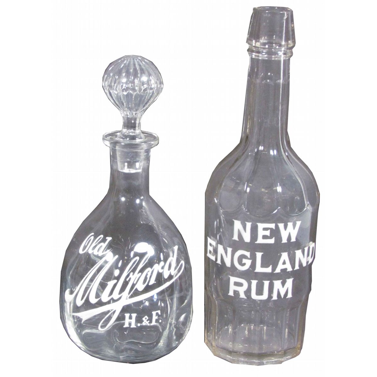 Two Enameled Label Back Bar Bottles. Old Milford pinch bottle and New England Rum. No chips or cracks. Large bottle measures 11 inches tall.