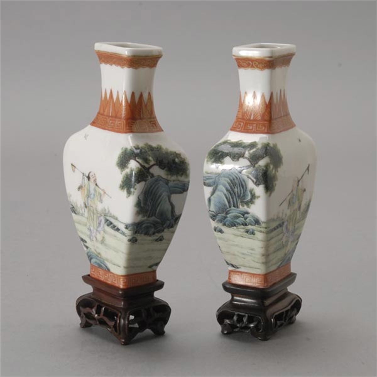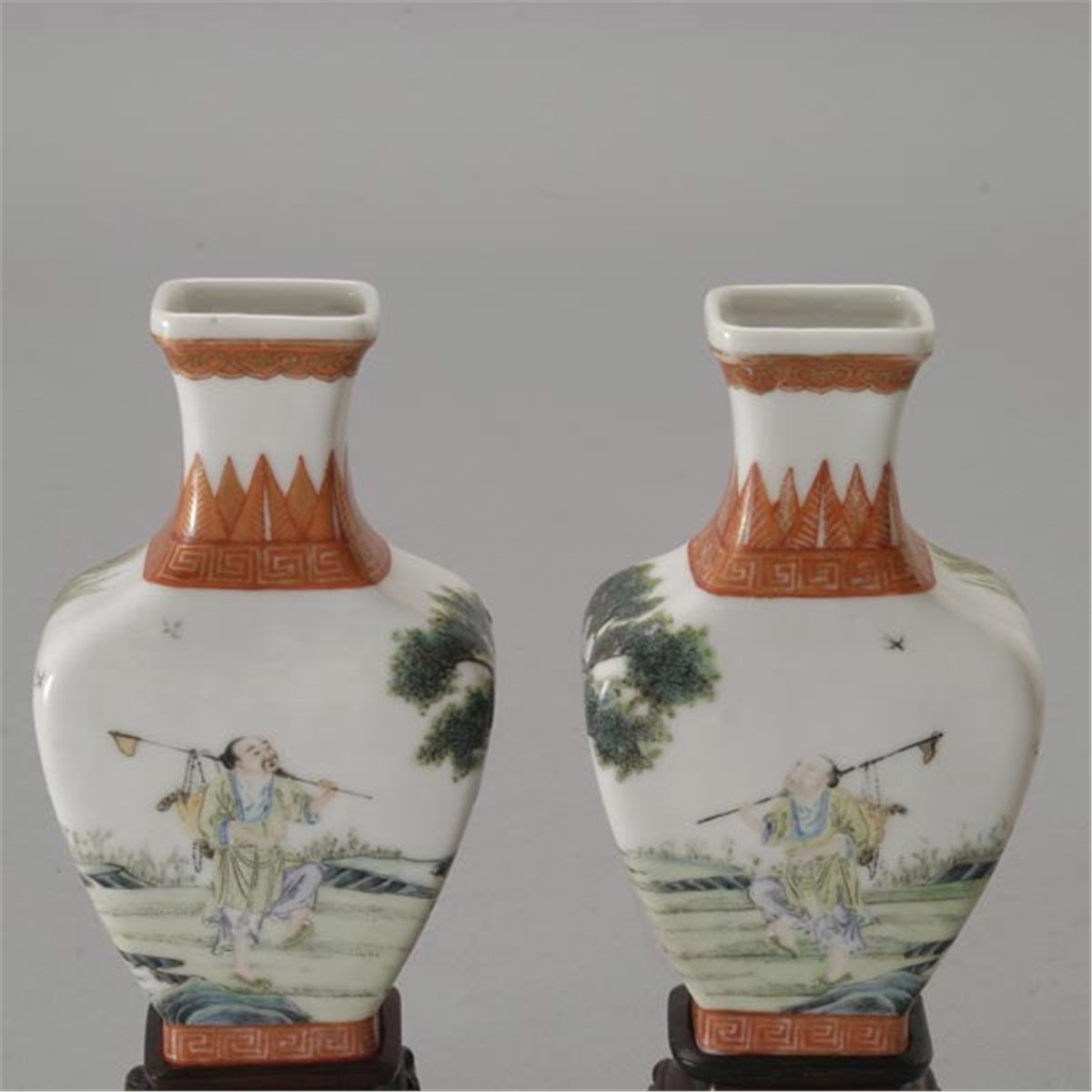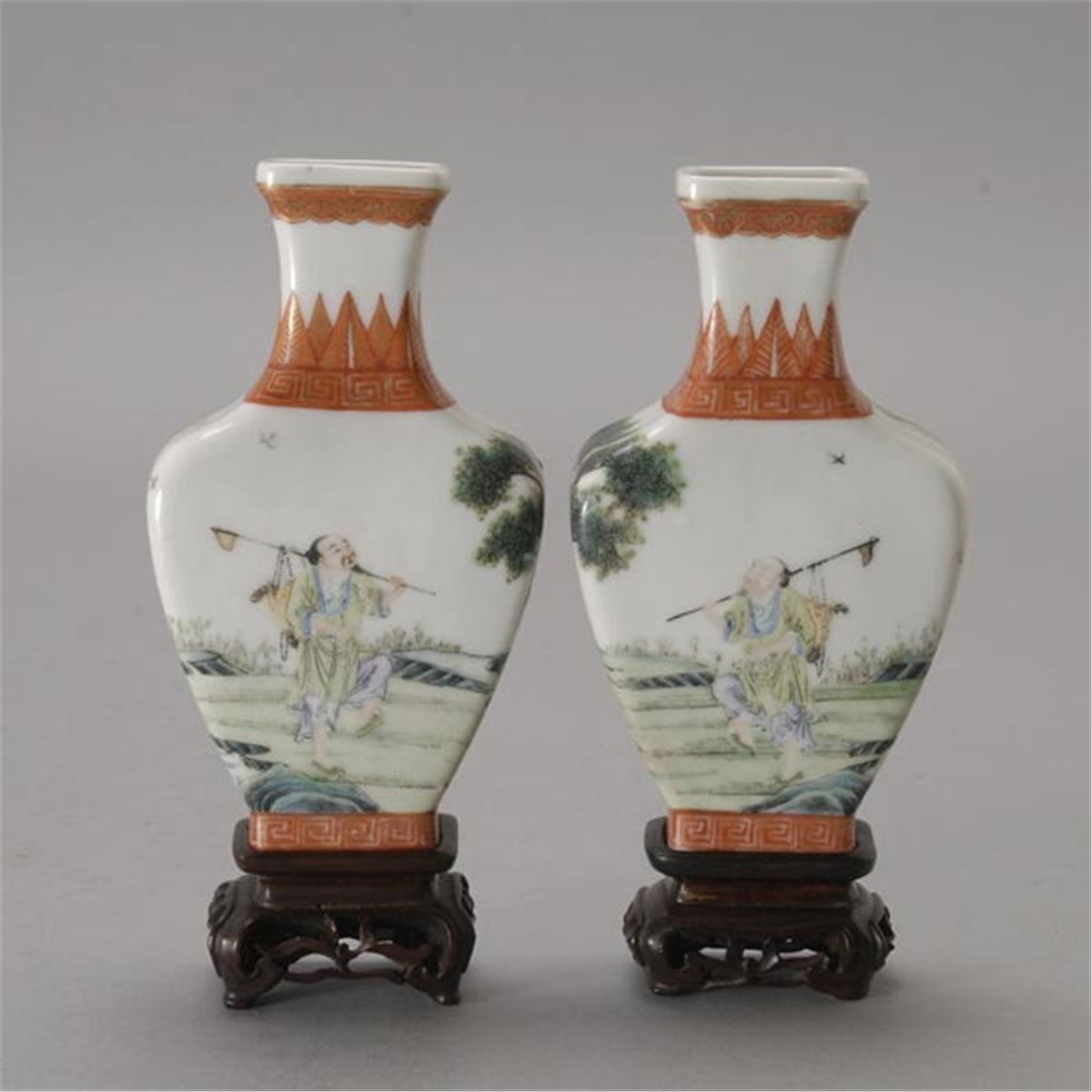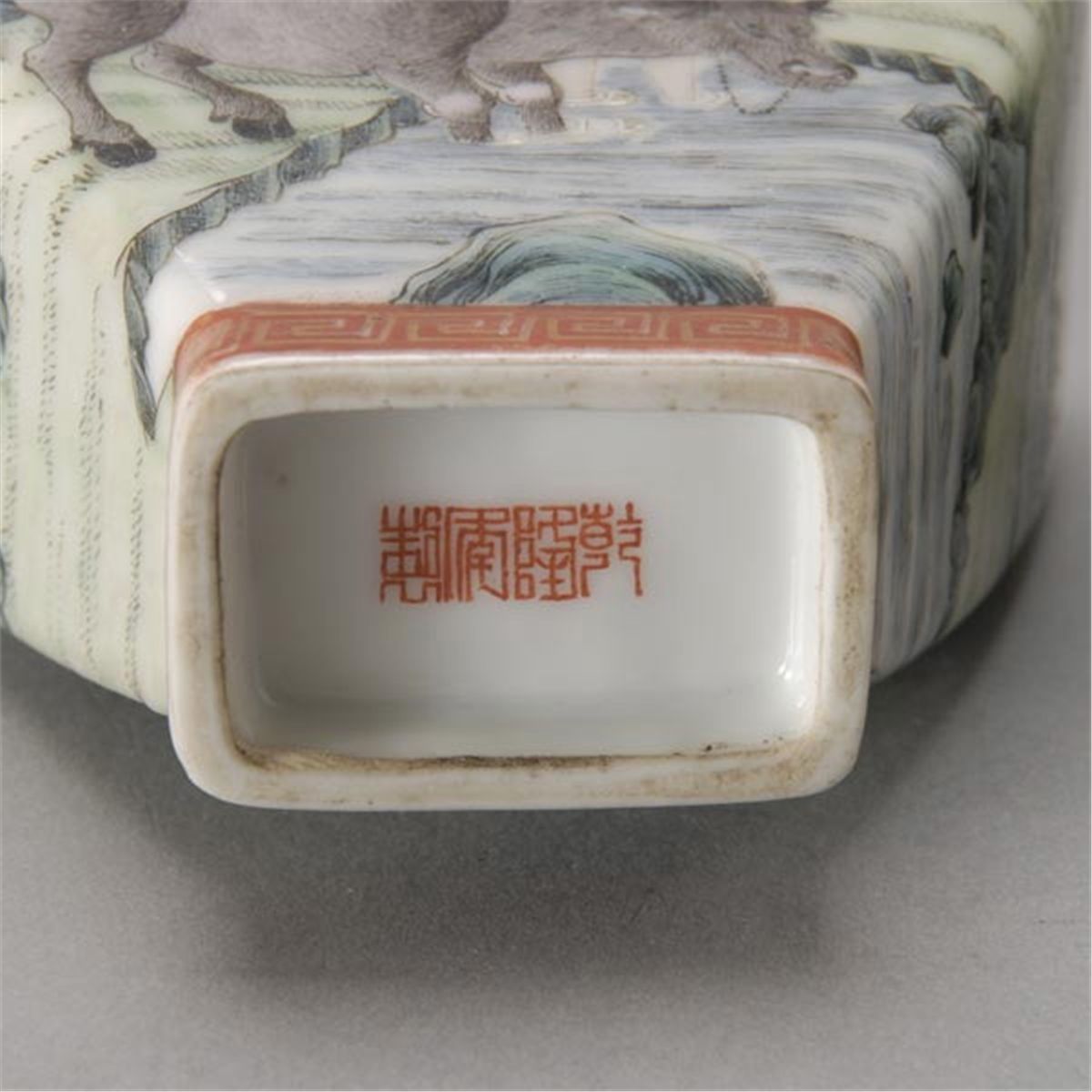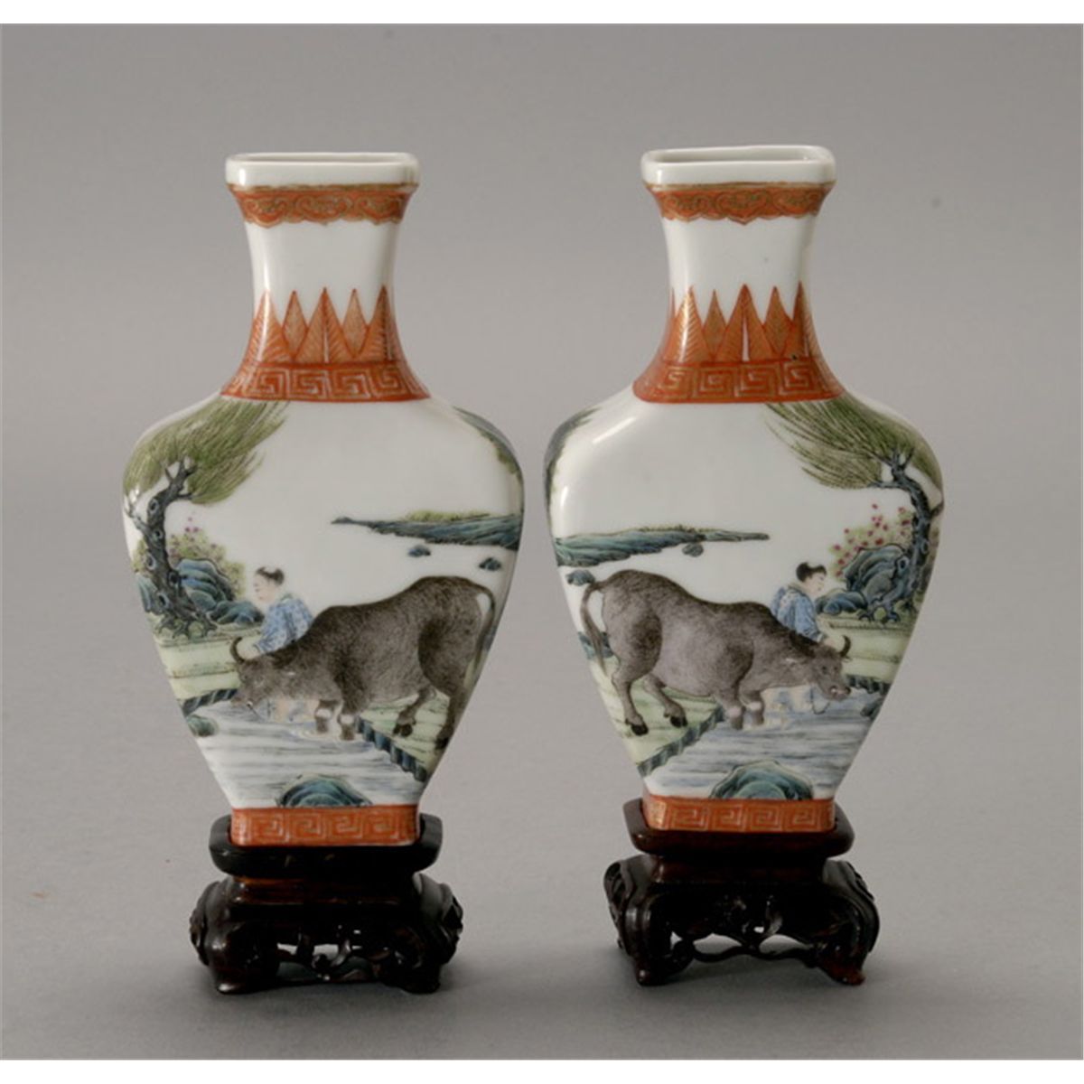 A Pair of Enameled Porcelain Vases, Each of flattened rectangular baluster shape, painted to the exterior with two figures herding a water buffalo in a idyllic landscape, the lower neck and the base decorated with a scrolling pattern, the base bearing a reign mark, with box and stands. Qianlong Mark, Late Qing/ Republic Period, Height of Each: 5 3/4 inches (14.6 cm) [Wear to gilding. This condition report states major condition issues only.]