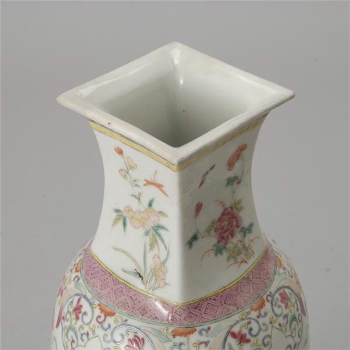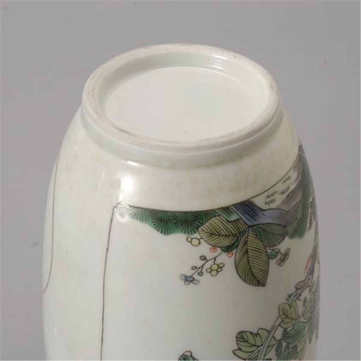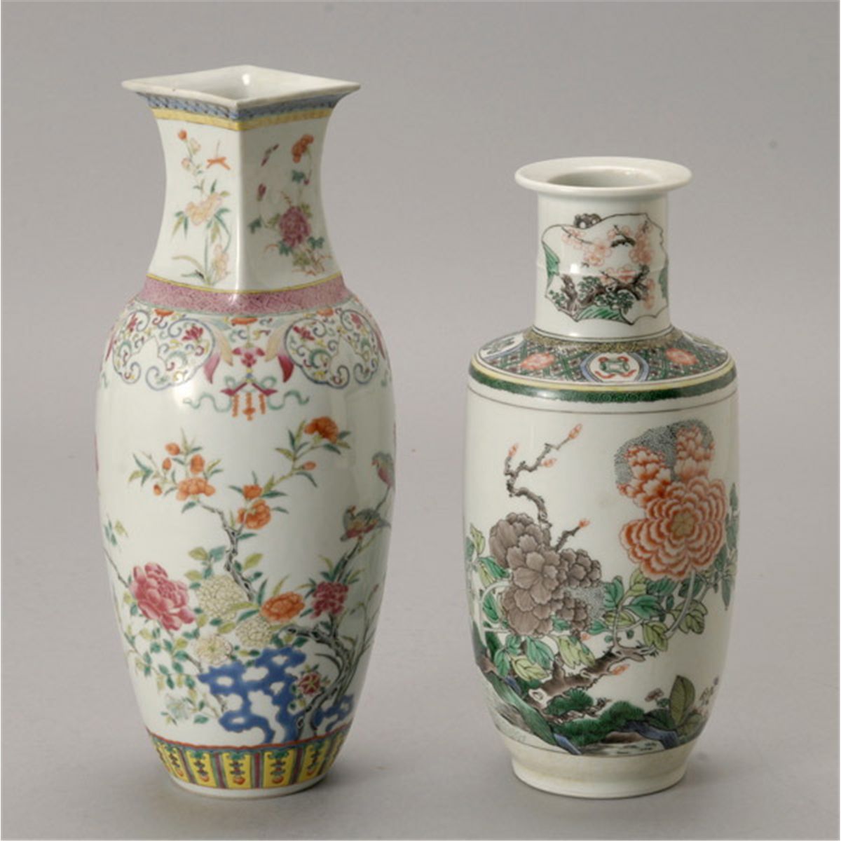 Two Enameled Porcelain Vases, The first painted in famille-verte enamel with various shapes of reserves of garden scene and calligraphy, the shoulder painted with a square-form diaper ground; the second painted in famille-rose enamel with birds and flowers, the neck of square-sectional form, the base bearing a six-character Qianlong seal mark. Qing Dynasty, Height of Tallest: 11 3/8 inches (29 cm)