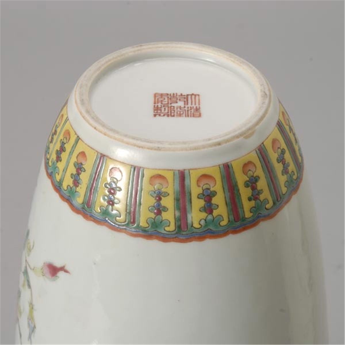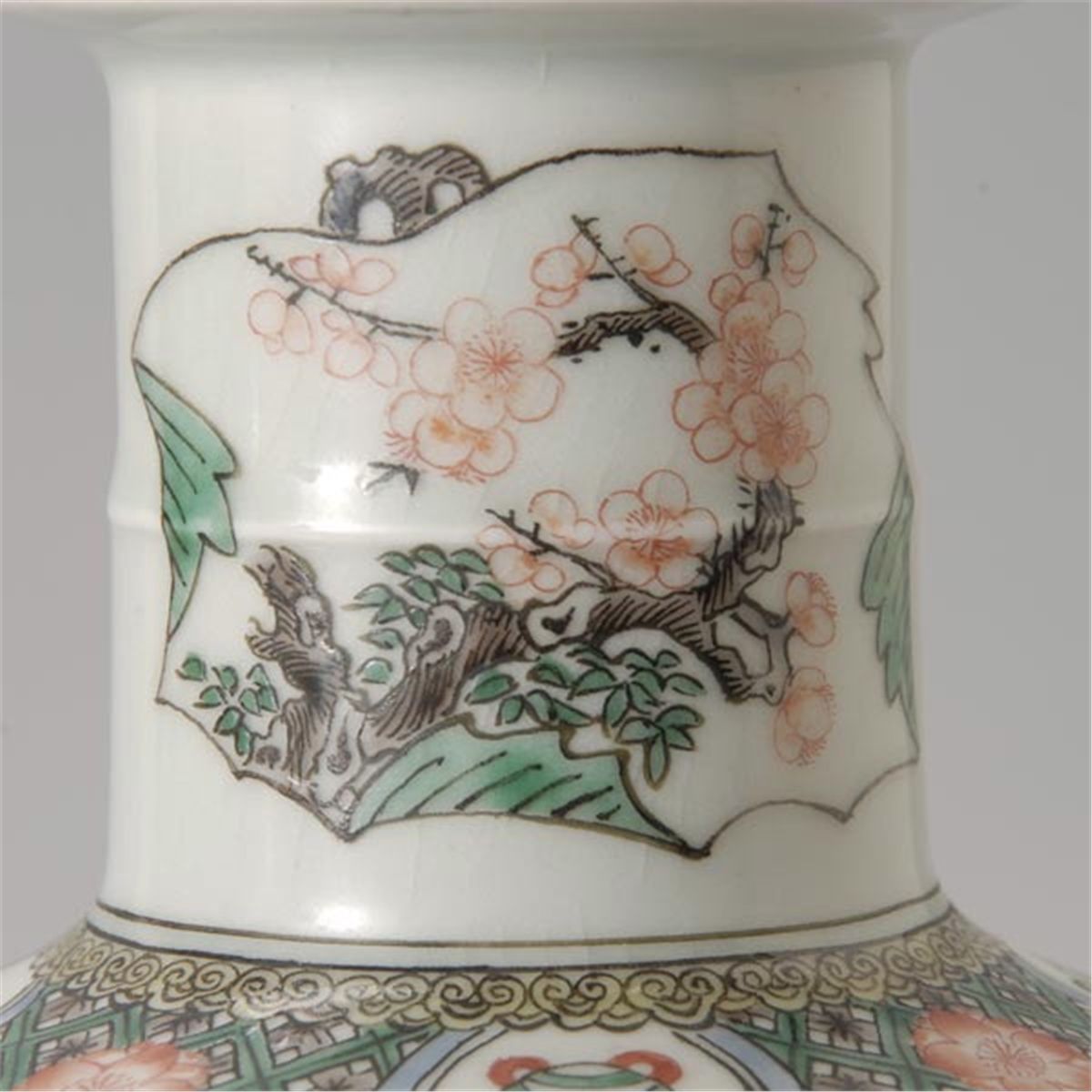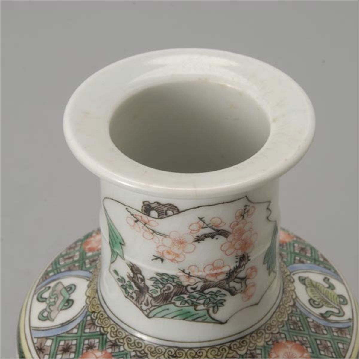 Two Enameled Porcelain Vases, The first painted in famille-verte enamel with various shapes of reserves of garden scene and calligraphy, the shoulder painted with a square-form diaper ground; the second painted in famille-rose enamel with birds and flowers, the neck of square-sectional form, the base bearing a six-character Qianlong seal mark. Qing Dynasty, Height of Tallest: 11 3/8 inches (29 cm)