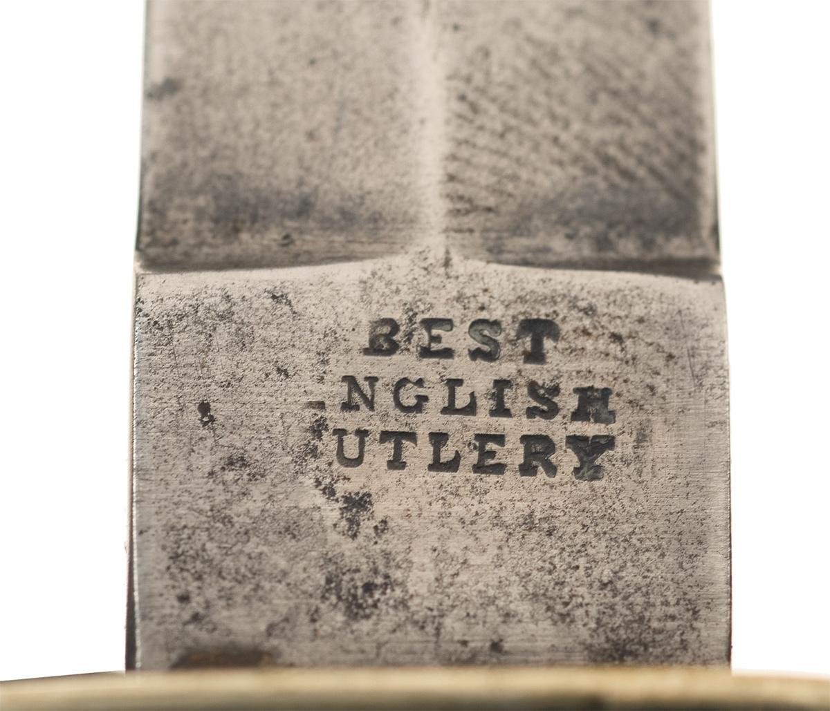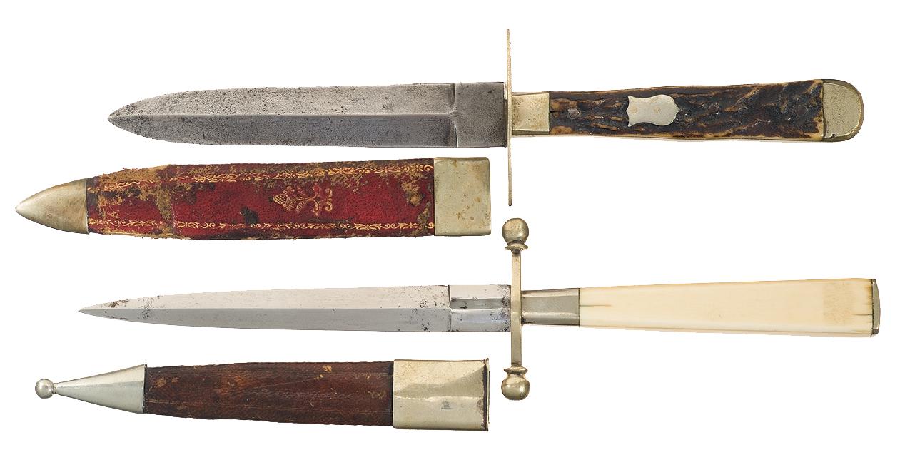 1) 4" blade marked "BEST / ENGLISH / CUTLERY". German Silver hilt with diamond shaped guard and stag scales with three rivets and a single silver shield. OAL: 7 3/4". With leather sheath adorned with gold filled accents and silver tip and throat. 2) English made. 4 3/4" blade, silver guard and flat pommel, with smooth one piece ivory handle. OAL: 8 3/4". With leather sheath with silver throat and tip.