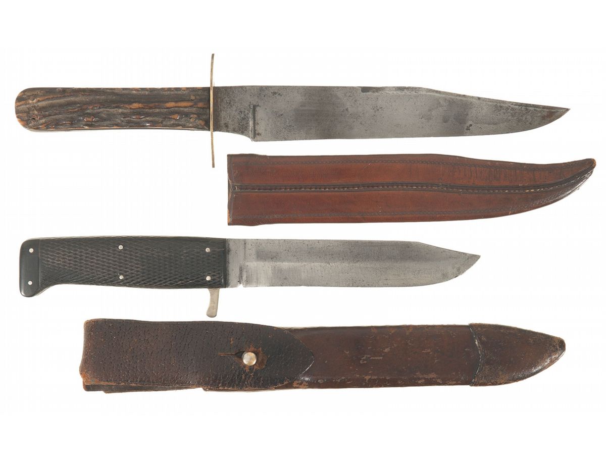1) G Wostenholm & Son bowie, 8" blade, 4 5/8" false edge, "I*XL" ricasso, oval brass guard, stag grips with blank inscription panel, and a leather sheath. OAL 12". 2) Hill & Son (London) bowie, 5 5/8" blade, 1 1/2" clip, checkered horn grips and a spring loaded German silver finger guard. With a brown leather sheath. OAL 10 1/8". Both are good, with signs of sharpening.