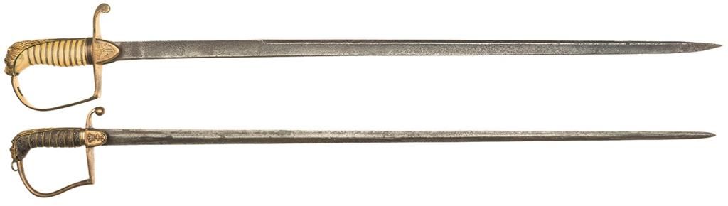 1) Naval officer's sword, 35 inches overall with a 30 inch blade, 22 inch false edge, and light engraving. The hilt is gilt brass, with hand-engraved fouled anchors on the languets, a sculpted lion head pommel, and a brass wire wrapped ivory grip. The hilt is good, with strong gold finish, well aged brass, and a few minor chips and cracks in the grip, which shows fine grain. The blade is in relic condition. 2) Naval officer's sword, 34 1/4 inches overall with a 30 inch unmarked double edged blade. The gilt brass hilt bears raised "crown/fouled anchor" designs on the languetsa lion head design on the pommel, and a wire wrapped snakeskin grip. Fair, with a mixed brown and gray patina on the blade, a welded repair to the knuckleguard and a few hints of glue on the grip.