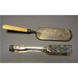 The first a pair of serving tongs, George William Adams, London, 1867; the second, an ivory handled cake server, maker's mark J.R, possibly John Round, Sheffield, 1909. Each marked.