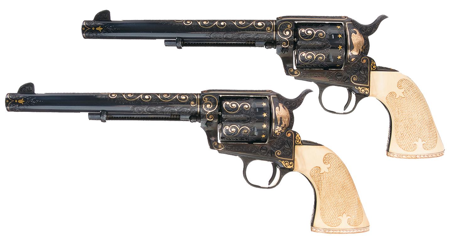 A) Manufactured in 1966. This revolver features floral scroll engraving on the barrel, frame, cylinder, hammer, backstrap, front sight and trigger guard, and a feather design on the sides of the top strap, top of the ejector housing and outer edges of the trigger guard plate. There are gold inlaid highlights throughout the scroll designs. In addition there is a decorative band, dot and Fleur de Lis design on the muzzle, a single gold band around the breech end of the barrel and gold band bordering on the frame, recoil shield and top of the backstrap. The recoil shield features a gold inlaid rear facing eagle with an olive branch in his talon on a matte background. The loading gate has a gold band border and in the center what appears to be a gold inlaid intertwined "RS" with a line beneath it. Around the rear of the cylinder are gold inlaid stars and the top of the backstrap has a yellow and rose gold sunflower on a matte background. The top of the barrel is marked with the standard one line address, the left side "COLT SINGLE ACTION ARMY .45" and the left side of the frame is marked with the two line, three patent dates followed by the Rampant Colt. The revolver is fitted with checkered ivory grips and a gold buttcap which is engraved with a floral scroll pattern around the edge and a crest in the center with a banner below which reads "SANS PEUR" (French translation: Without Fear). This revolver is consecutively serial numbered to another engraved, gold inlaid Single Action Army revolver in this auction.