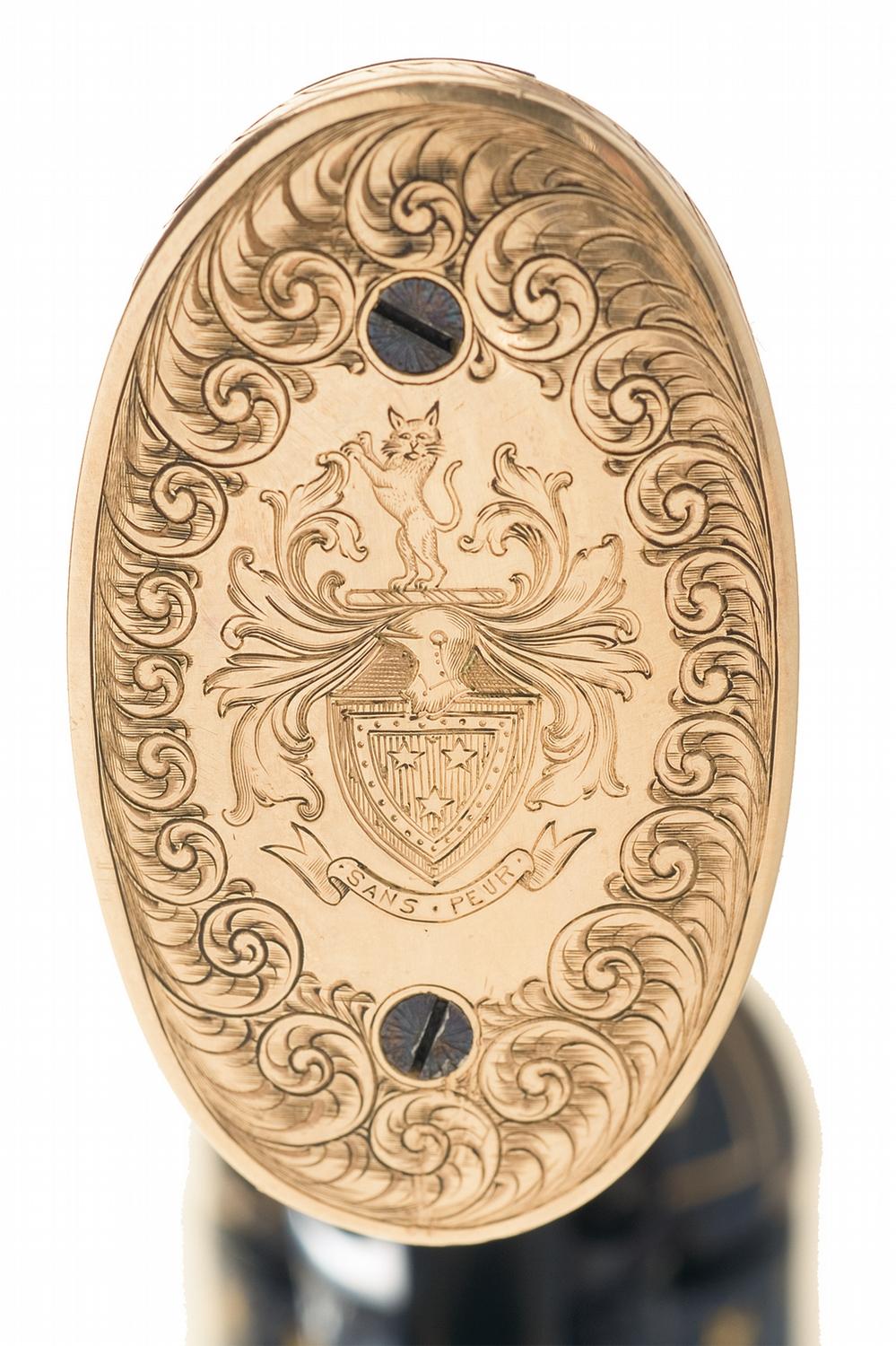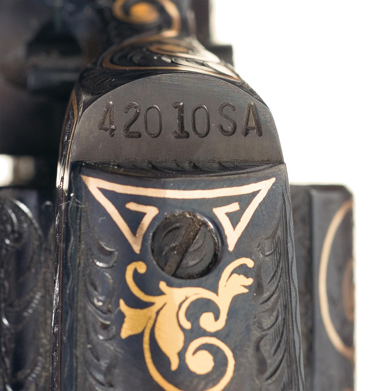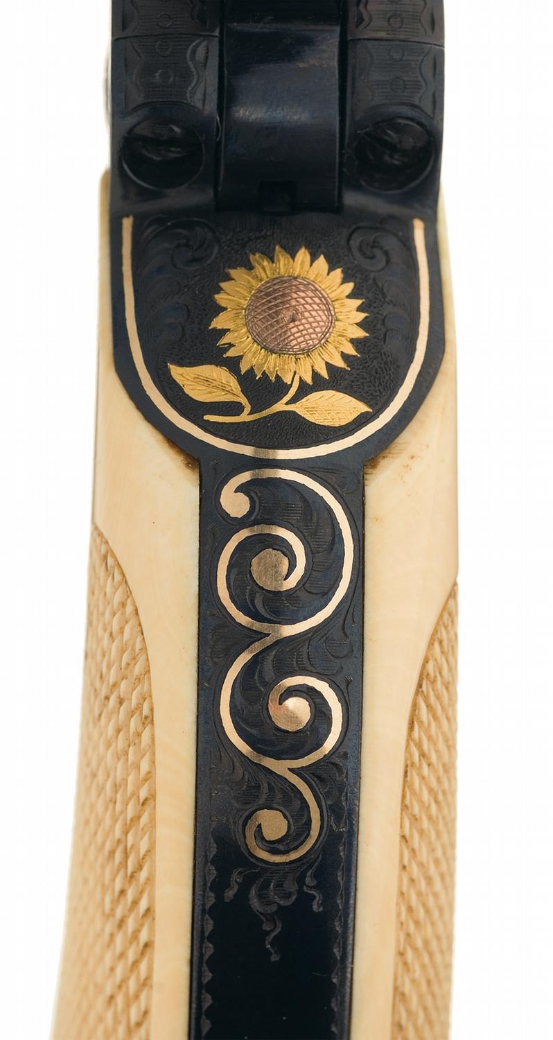 Manufactured in 1966. This revolver features floral scroll engraving on the barrel, frame, cylinder, hammer, backstrap, front sight and trigger guard, and a feather design on the sides of the top strap, top of the ejector housing and outer edges of the trigger guard plate. There are gold inlaid highlights throughout the scroll designs. In addition there is a decorative band, dot and Fleur de Lis design on the muzzle, a single gold band around the breech end of the barrel and gold band bordering on the frame, recoil shield and top of the backstrap. The recoil shield features a gold inlaid American eagle with an olive branch and arrows in his talons on a matte background. The loading gate has a gold band border and in the center what appears to be a gold inlaid intertwined "RS" with a line beneath it. Around the rear of the cylinder are gold inlaid stars and the top of the backstrap has a yellow and rose gold sunflower on a matte background. The top of the barrel is marked with the standard one line address, the left side "COLT SINGLE ACTION ARMY .45" and the left side of the frame is marked with the two line, three patent dates followed by the Rampant Colt. The revolver is fitted with checkered ivory grips and a gold buttcap which is engraved with a floral scroll pattern around the edge and a crest in the center with a banner below which reads "SANS PEUR" (French translation: Without Fear). This revolver is consecutively serial numbered to another engraved, gold inlaid Single Action Army revolver in this auction.