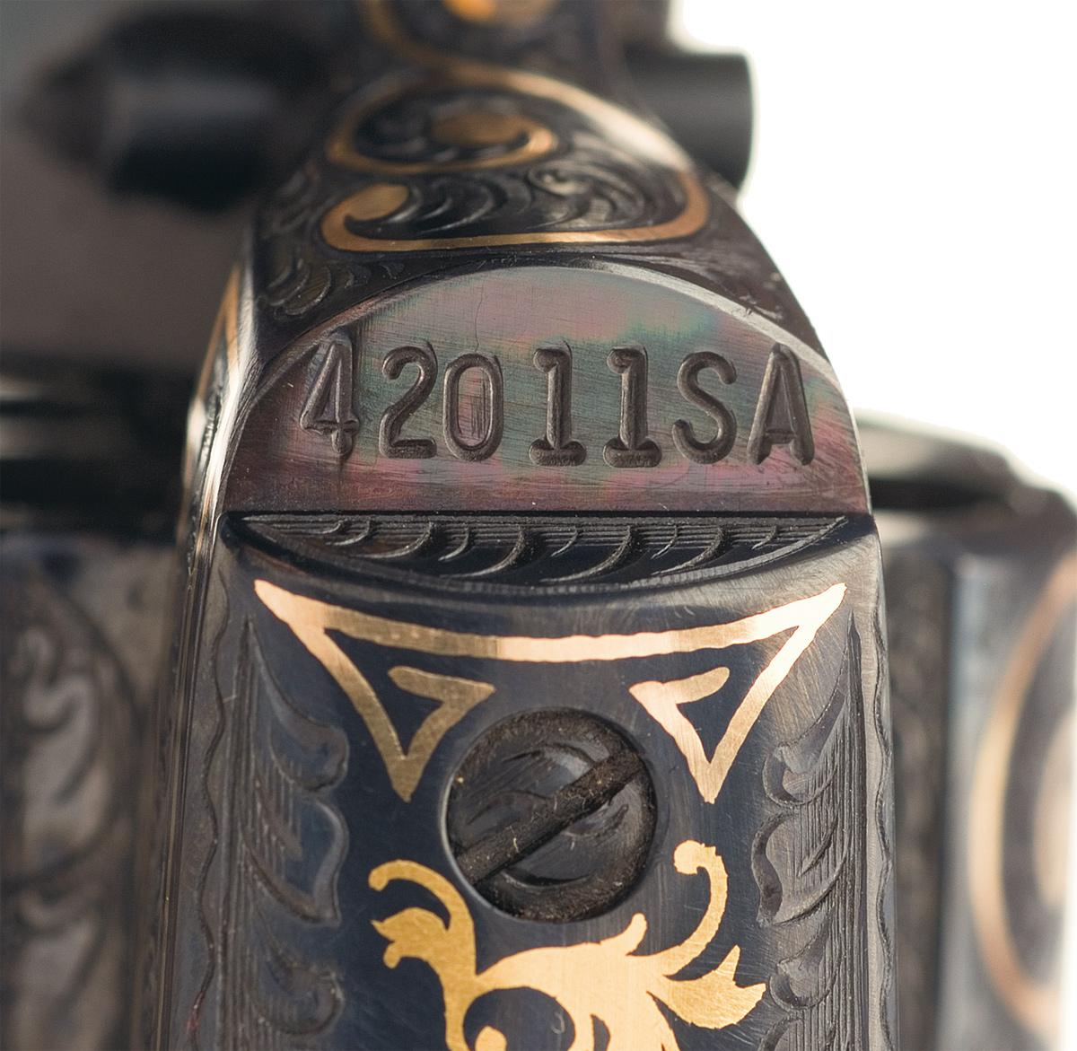 Condition: Near mint as professionally custom embellished. The revolver retains 99% plus of the bright blue finish with a few minor scratches on the front underside portion of the barrel and light handling marks overall. All of the gold inlay remains and the engraving is sharp. The grips are excellent with an attractive aged patina in the grain and some overall darkening with age.There is a small ding on the toe of the buttcap. The checkering remains crisp, but is a litle soiled.
