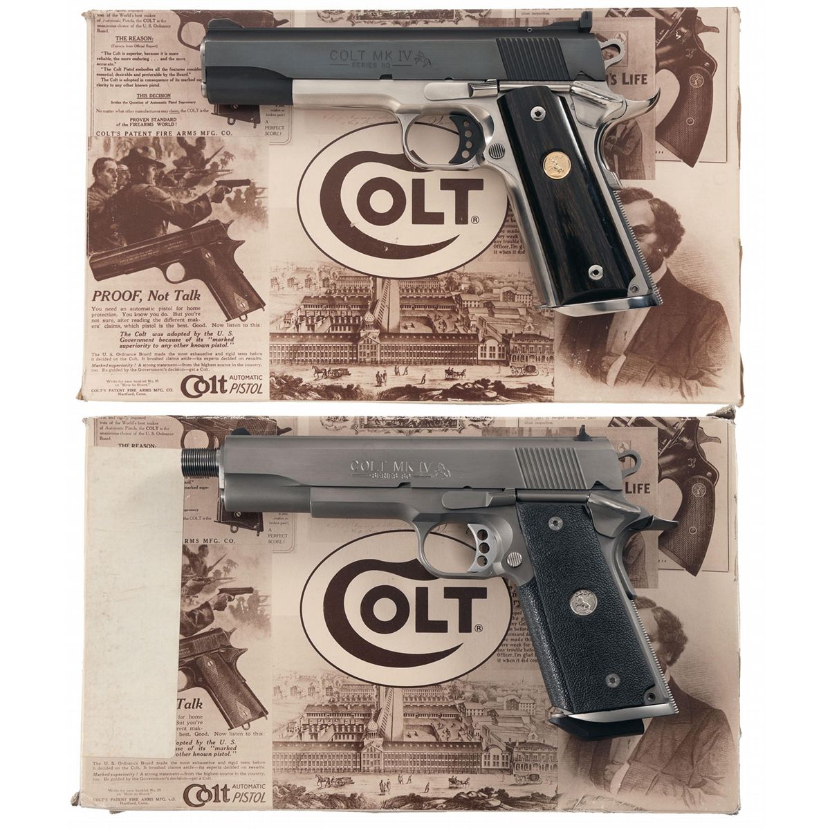 - B) Introduced in 1992. Flat top slide with the enhanced ejection port. Polished and matte stainless finish with fixed 3-dot front and rear sights. Serrated trigger, slide catch, thumb safety, hammer with a flat checkered mainspring housing and extended, beveled mag well. The barrel is extended and threaded for a silencer. Standard markings and fitted with wraparound rubber grips with the silver Colt medallions. Complete with blue hard case and Colt picture box numbered to the gun.