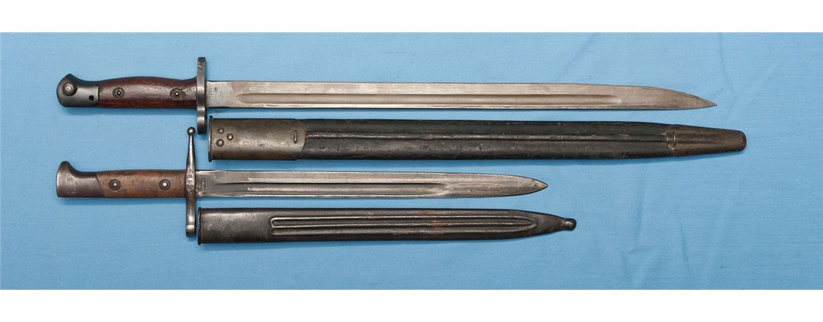 1) British proofed 1907 bayonet with a 17 inch blade and leather scabbard. 2) Italian bayonet with an 11 1/2 inch blade and a metal scabbard. CONDITION: Fair to good.