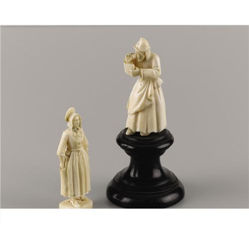 <B>Two French Carved Ivory Figures</B></I><BR><BR>Unknown maker, possibly Dieppe, France<BR>Late Nineteenth/Early Twentieth Century<BR>Ivory and wood<BR>Unmarked<BR>3.37 in. high<BR><BR>Women wearing hats; one with an apron, holding a book and spectacles; the other carrying fish with one hand in her pocket, carved wood plinth<BR>1 <BR><BR><B>Condition Report:</B> Wear commensurate with age, small chips and old repair